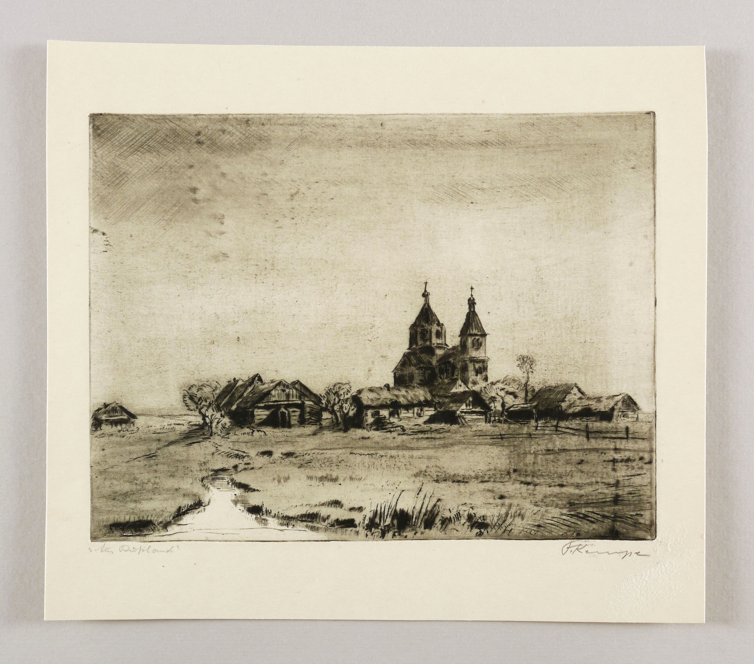 Rechts unten in Bleistift signiert: ″F. Kempe″. Links betitelt: ″Aus Russland″. – Eine sehr ähnliche, vielleicht aber nicht identische Holzkirche russischen Stils, die 1866 erbaute römisch-katholische Kirche Konstantin und Alena in Waloschyn (Валожын), nordöstlich von Minsk. – Sehr guter Zustand.