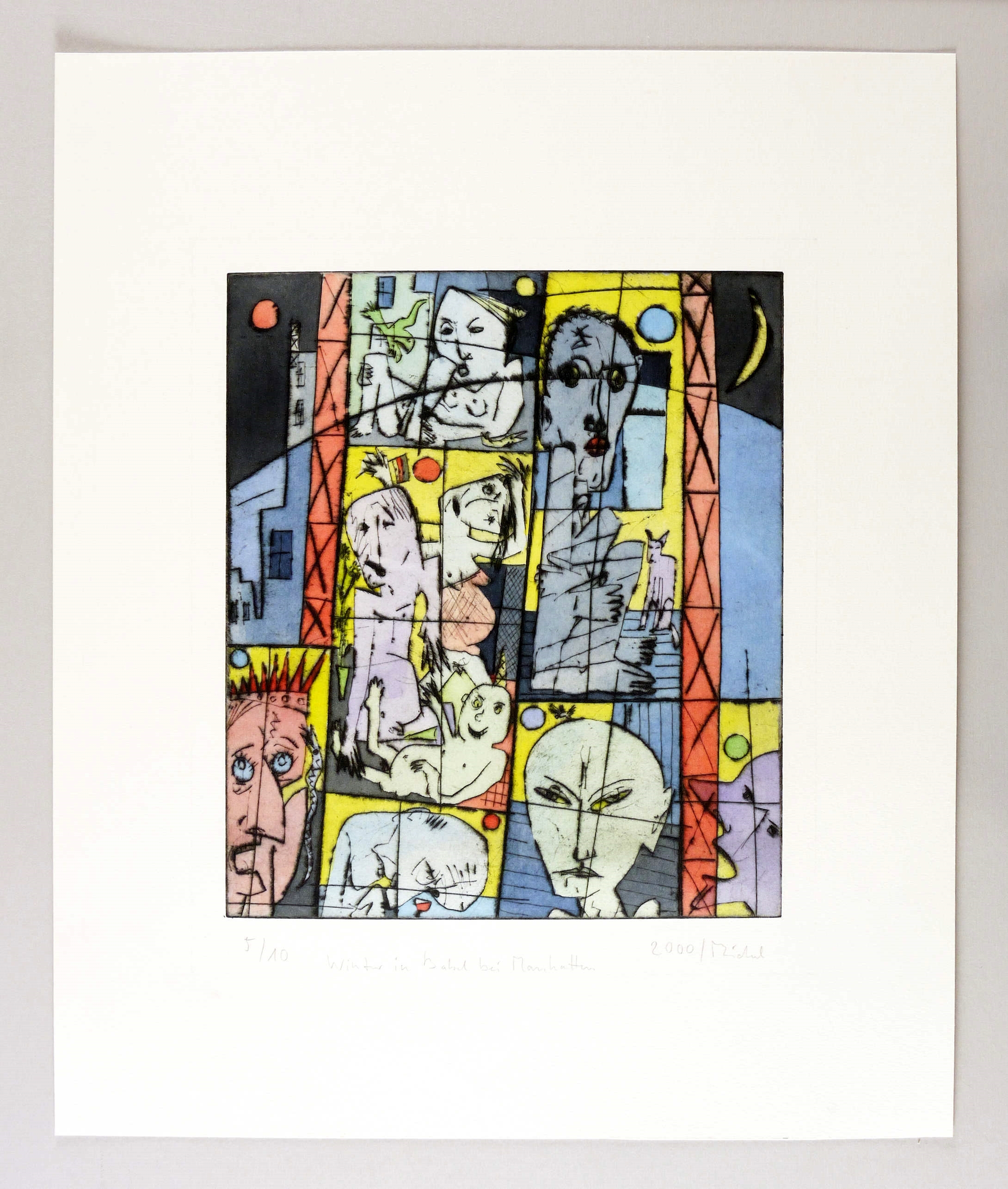 2000. Farbradierung / Aquatinta & Kaltnadel, in 6 Farben, auf gehämmertem hellchamois Velinkarton. – Von Bernhard Michel. – Auflage Exemplar Nr. 5/10. – 34,8 x 30,0 cm (Darstellung / Platte), 59 x 49 cm (Blatt).