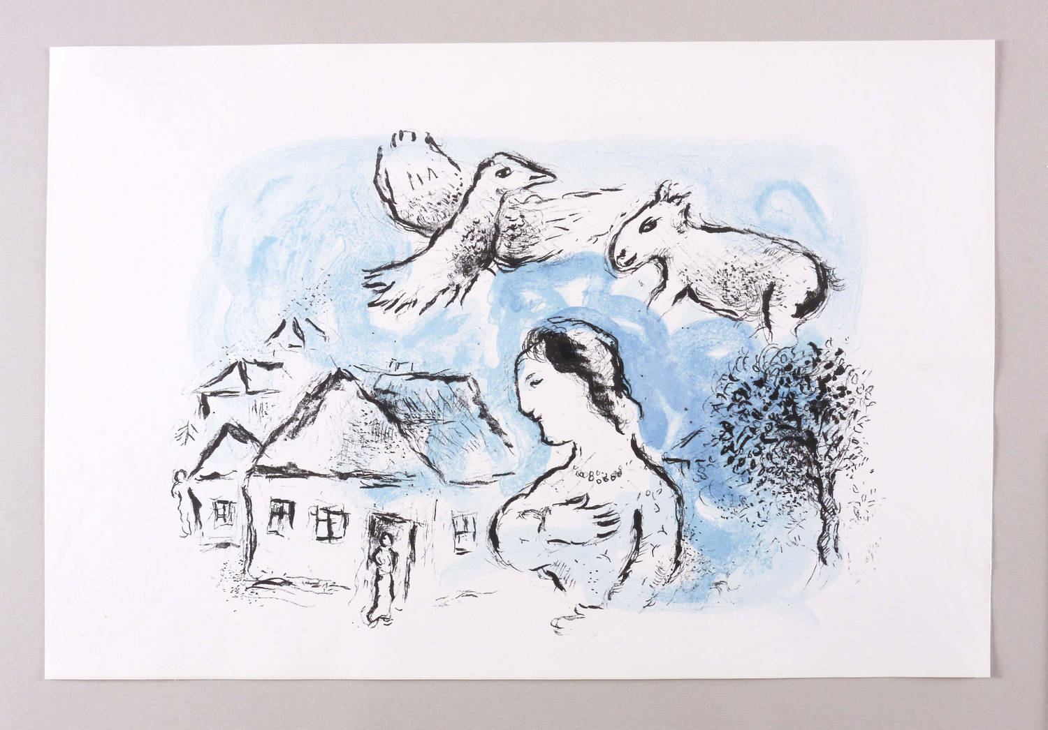 1977. Farblithografie / Pinsellithografie, in Blau, Hellgrau & Schwarz, auf festem weißem Velin. – Originale Künstlergrafik, von Marc Chagall. – Auflage 15000 Exemplare. – 29,3 x 56,4 cm (Darstellung / Druckbild), 38 x 56 cm (Blatt).