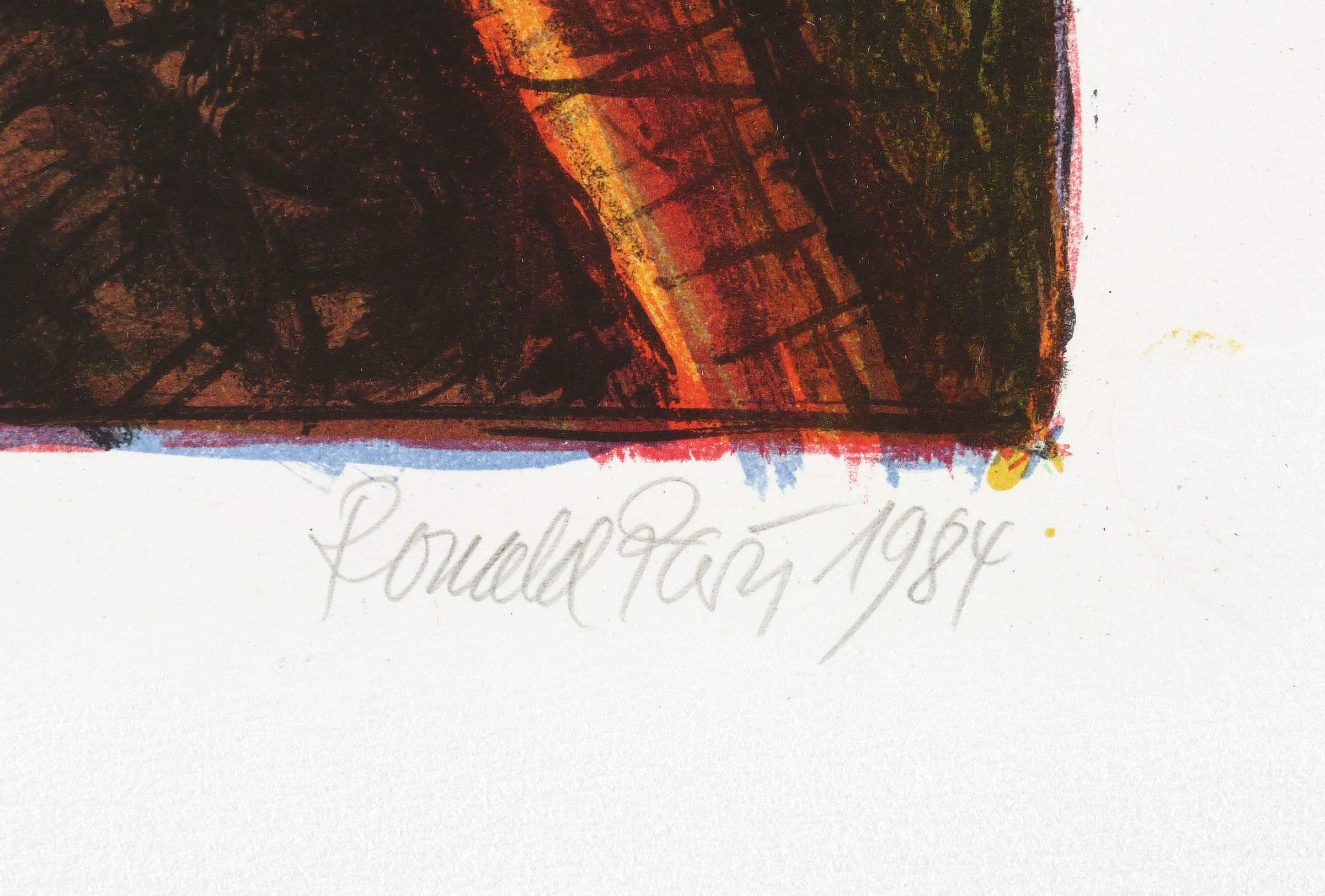 1984. Farblithografie / Kreidelithografie, in 6 Farben, auf schwerem hellchamois Velin. – Originale Künstlergrafik, von Ronald Paris. – Auflage Exemplar Nr. 26/50. – 46,7 x 31,4 cm (Darstellung / Stein), 57 x 40 cm (Blatt).