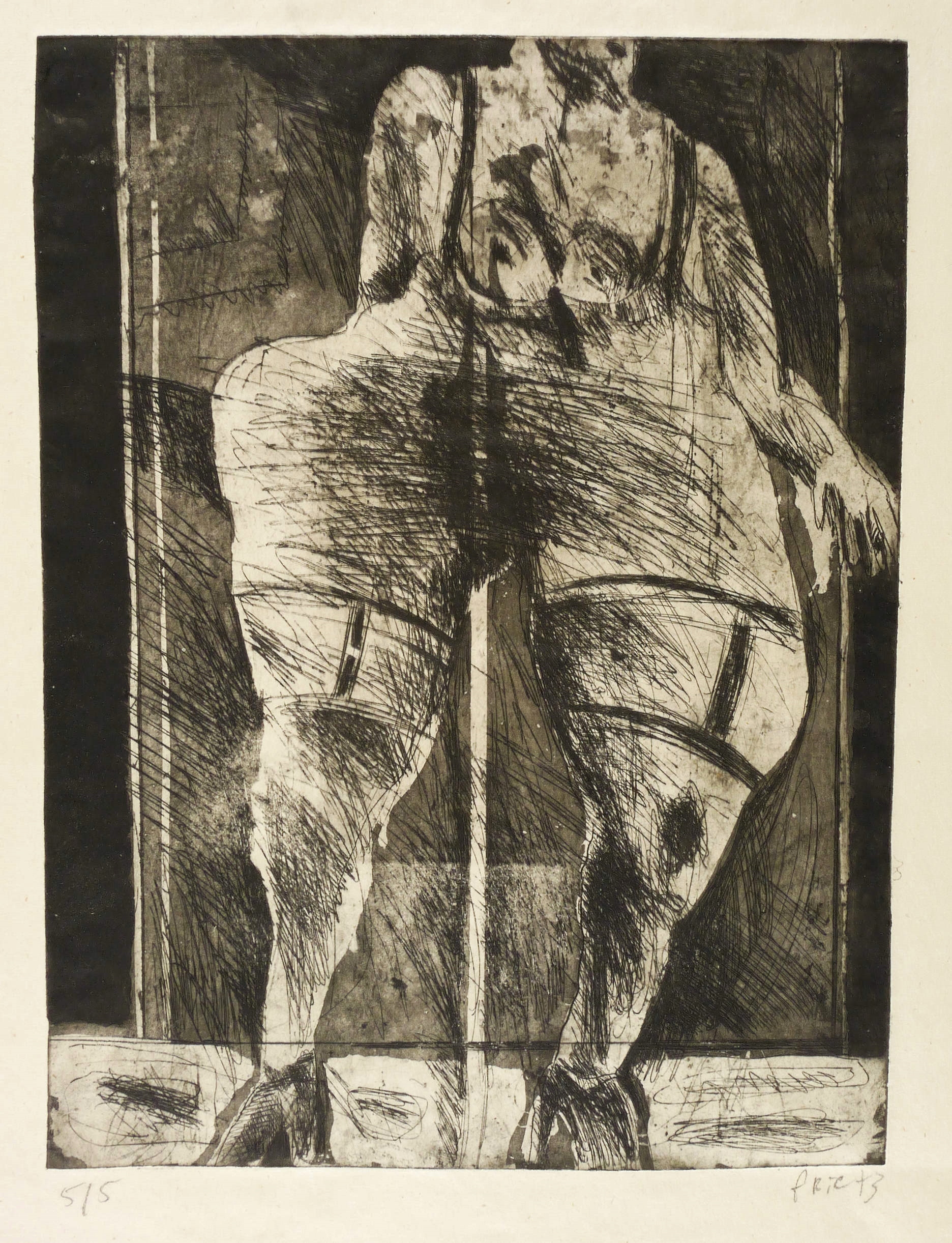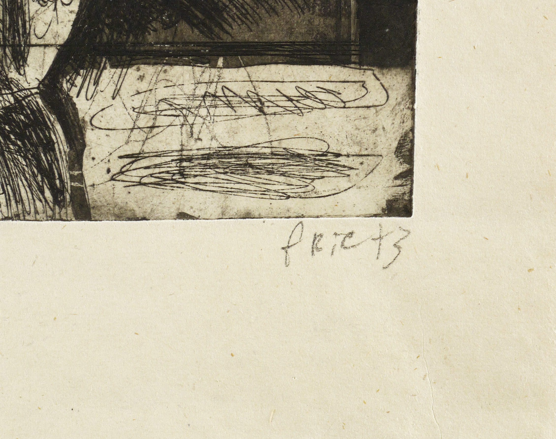 1973. Radierung / Aquatinta & Strichätzung, in Schwarz, auf hartem gelbem Velin. – Von Jürgen Friedrich. – Auflage Exemplar Nr. 5/5. – 34,7 x 26,1 cm (Darstellung / Platte), 50 x 33 cm (Blatt).