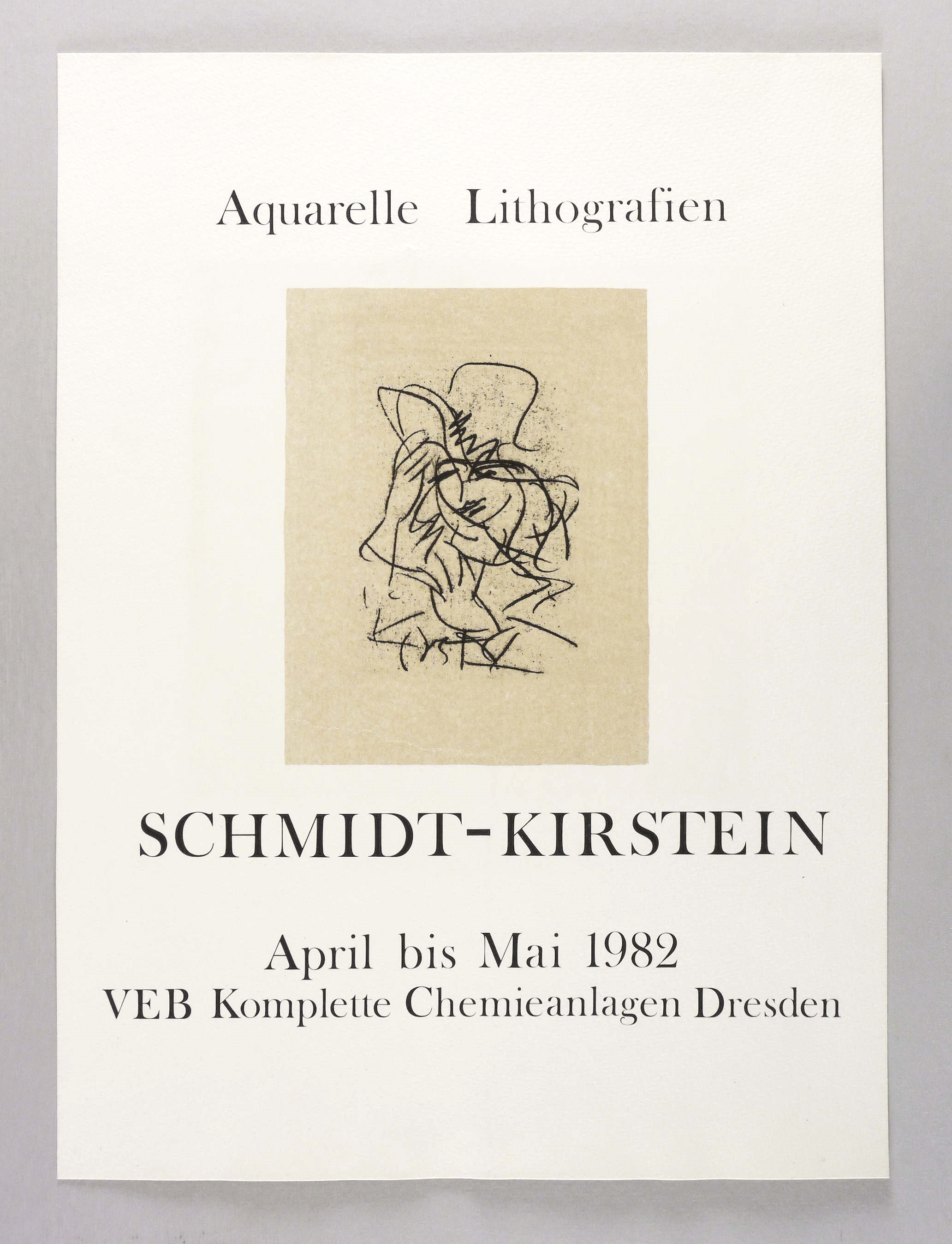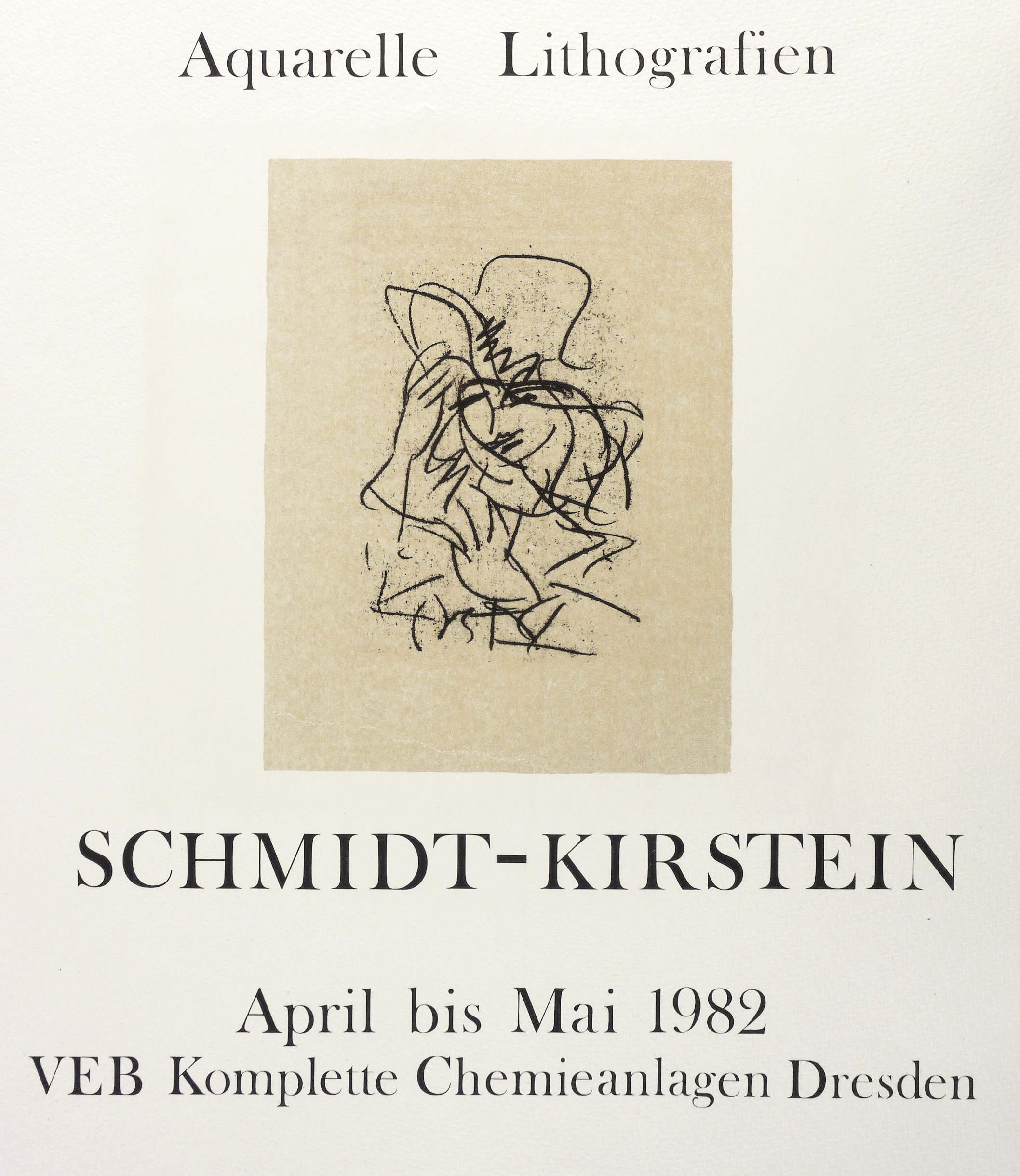 Nicht handsigniert. Im Stein unten signiert: ″Kirstein″. Typografisch bezeichnet. – Originalgrafisches Plakat zur Ausstellung ″Schmidt-Kirstein. Aquarelle. Lithografien″ April-Mai 1982 im VEB Komplette Chemieanlagen Dresden. – Keine Mängel. Sehr guter Zustand.