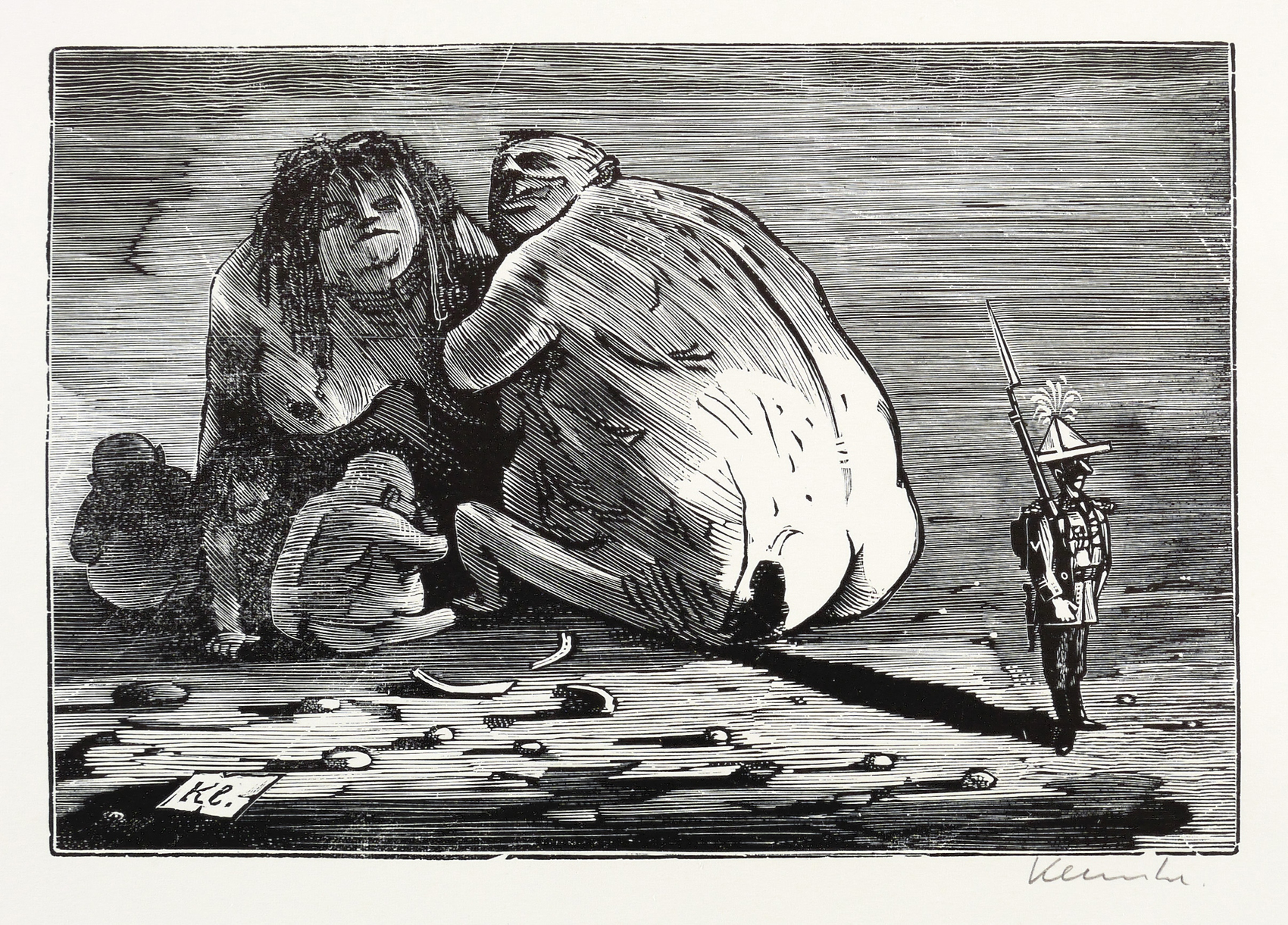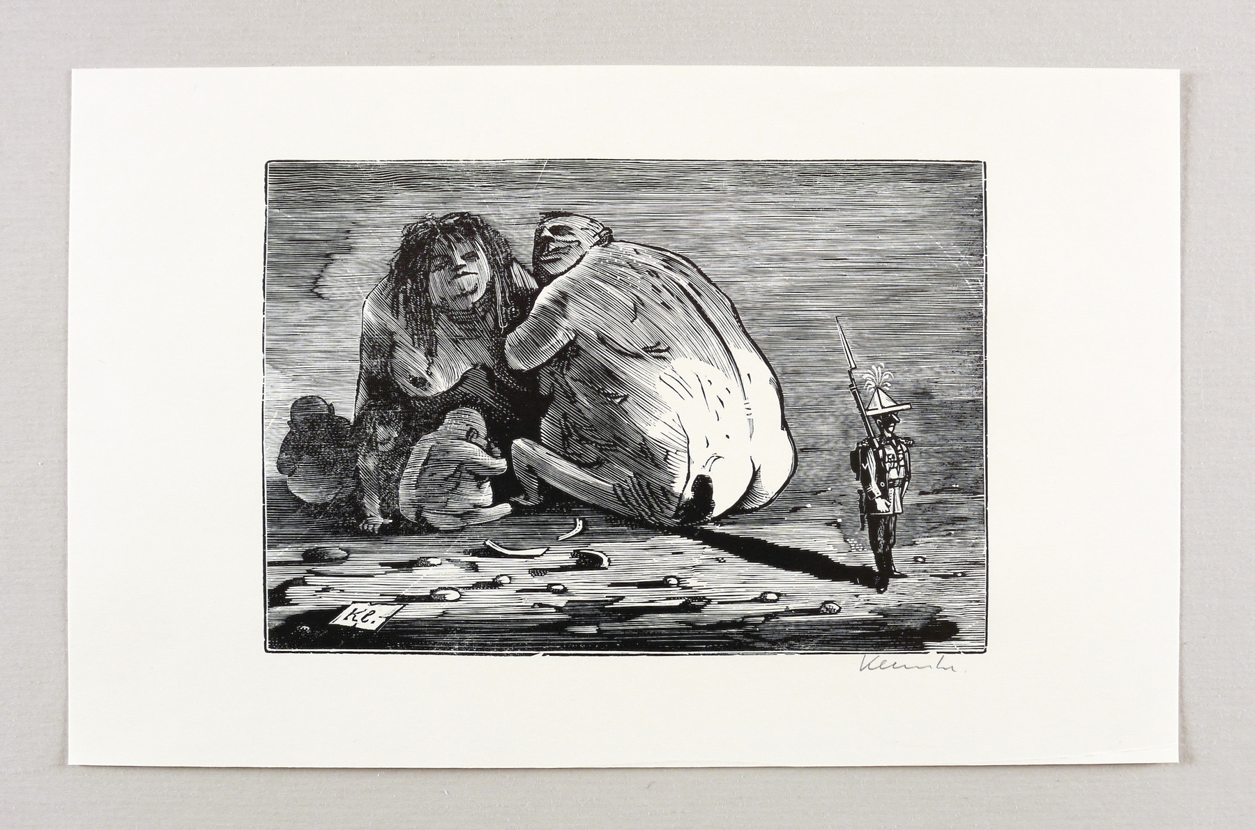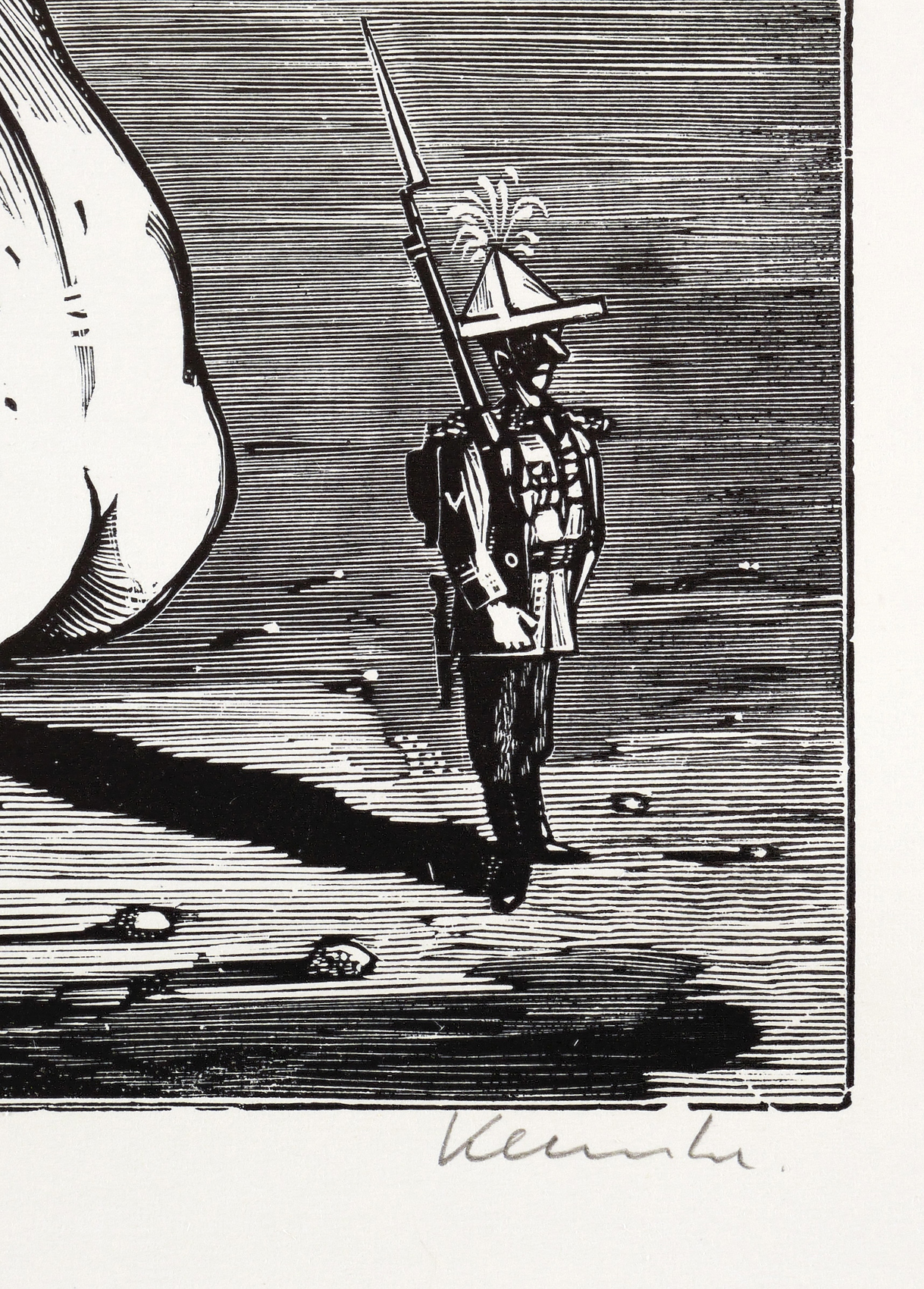 Aus: Ulenspiegel. Literatur, Kunst, Satire (Berlin-Dahlem: Ulenspiegel-Verlag 1950), Bd. 5. – Rechts unten in Bleistift signiert: ″Klemke″. Im Holzstock links unten Signet. – Sehr guter Zustand.