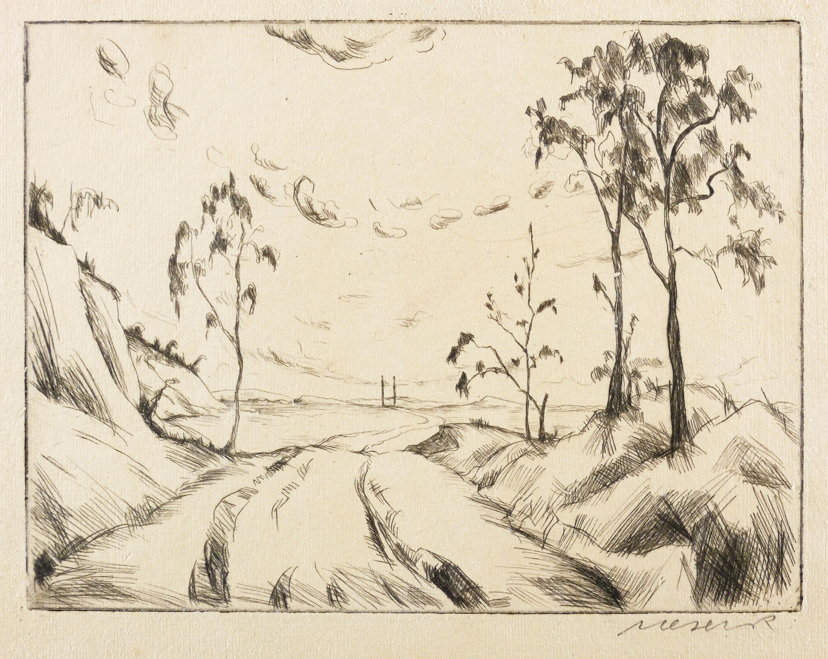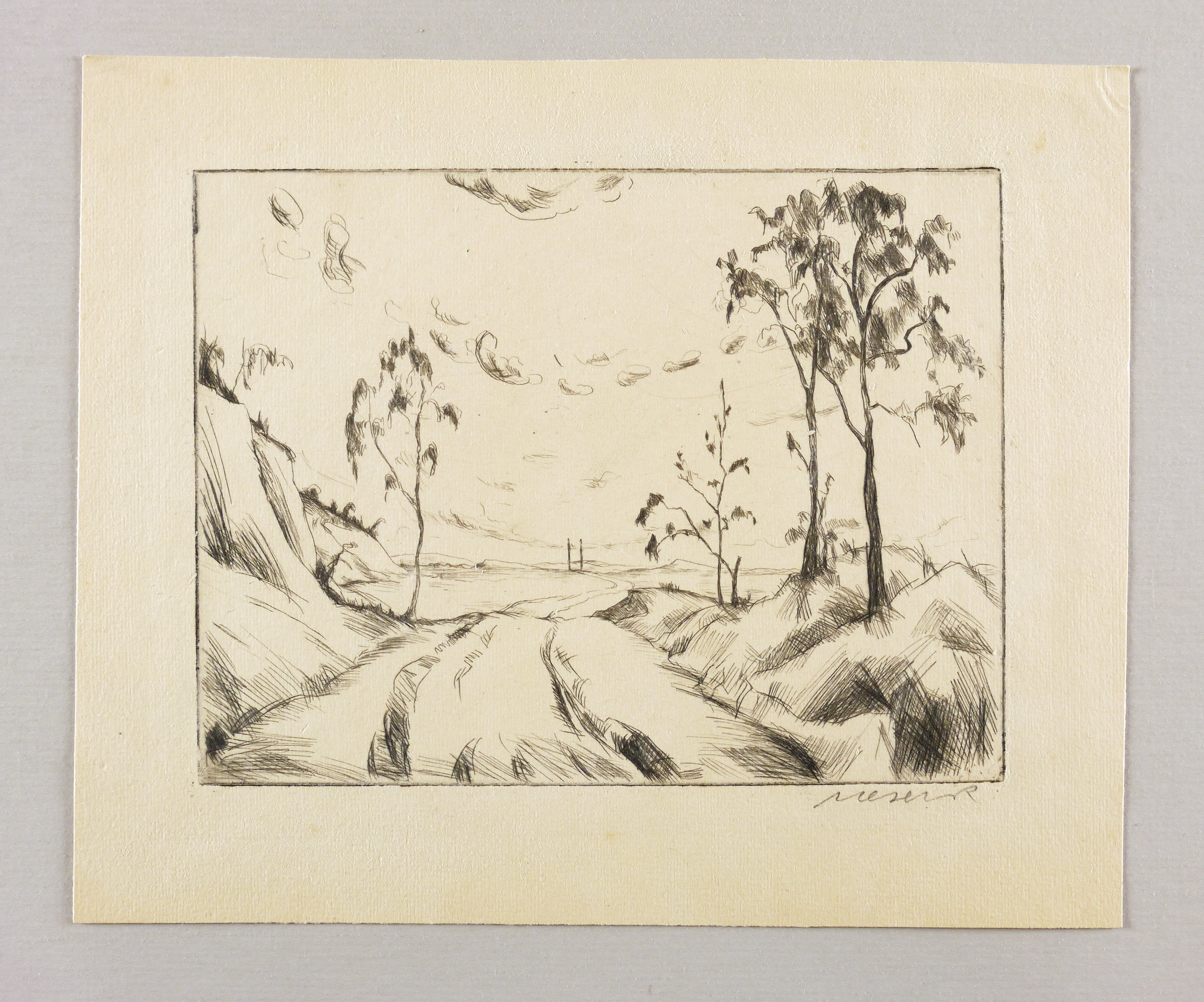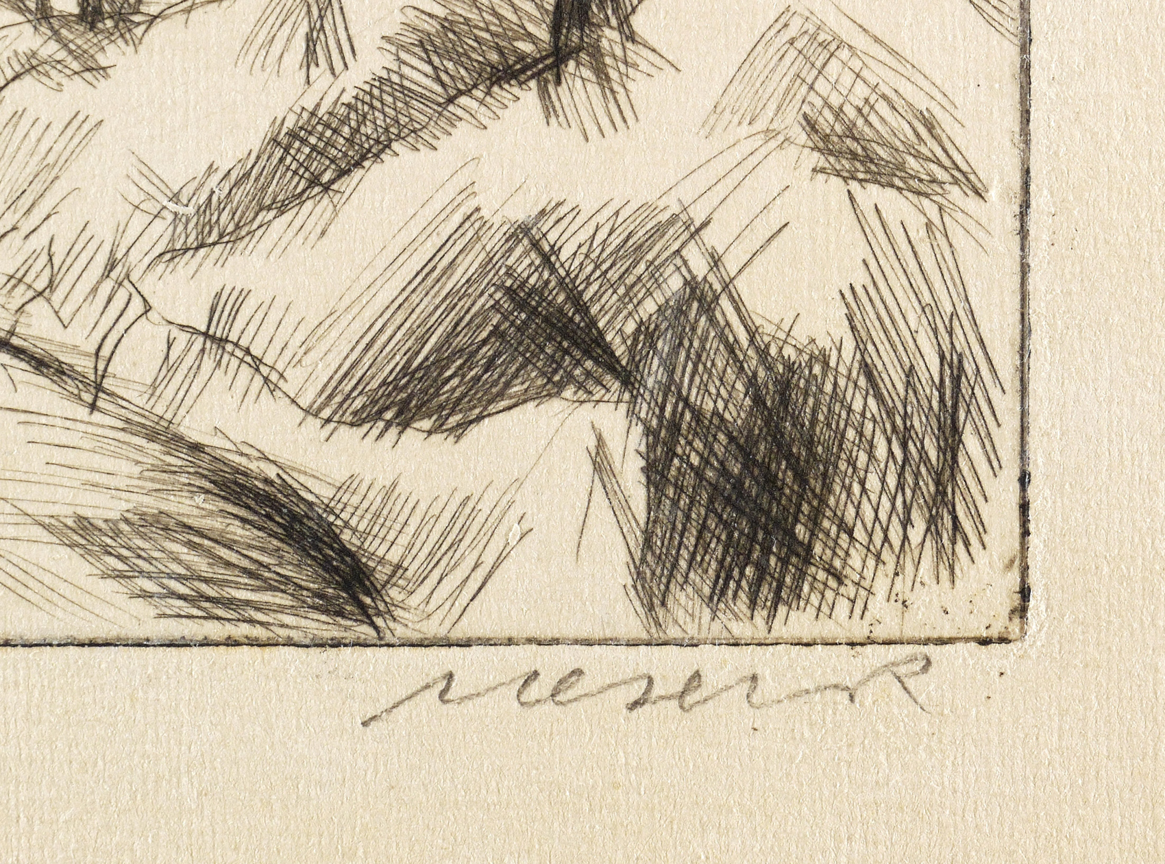 1920-1930. Radierung / Kaltnadel, in Schwarz, auf gelbem Velin. – Originale Künstlergrafik, von Felix Meseck. – 14,9 x 19,4 cm (Darstellung / Platte), 21 x 26 cm (Blatt).