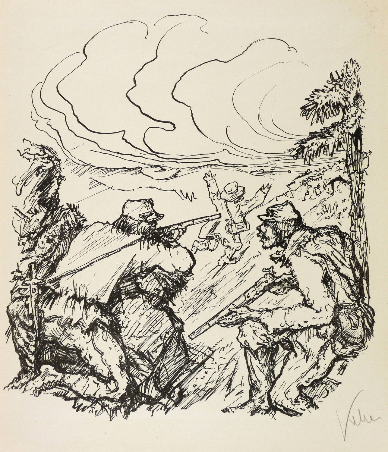 Alfred Kubin (1877 Leitmeritz - 1959 Zwickledt). Eigentlich Alfred Leopold Isidor Kubin. Österreichischer Grafiker und Illustrator. Ausbildung zum Fotografen bei einem Onkel in Klagenfurt. Frühe Beeinflussung durch den metaphysischen Pessimismus Artur Schopenhauers. 1898/99 der Besuch an der Königlichen Akademie in München bei Nikolaus Gysis, daneben andere private Zeichenschulen (z.B. bei Ludwig Schmidt-Reutte). 1899 inspiriert ihn Max Klingers Radierzyklus 'Paraphrase über den Fund eines Handschuhs' zu seiner ersten großen Schaffensphase bis 1903. Bekanntschaft mit Bruno Cassirer. 1909 Entstehung des phantastischen Romans 'Die andere Seite' mit eigenen Illustrationen. 1911 Mitglied der Künstlergruppe "Blauer Reiter". Er illustriert in seinem Leben ca. 60 Bücher, u.a. Dostojewski und Poe. Der frühe Tod der Mutter und die Spannungen mit dem Vater führten zu seelischen Krisen und andauernder Melancholie. Das Geheimnisvoll-Imaginative, das Unheimliche und Alptraumhafte sind typisch für sein Werk und erinnern an Goya und Redon.