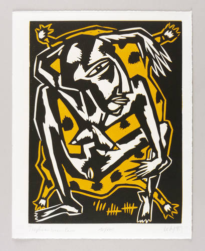 1995. Farbholzschnitt, in Gelb-Orange & Schwarz, auf dickem weißem Velin. – Von Klaus Süß. – Auflage Exemplar Nr. 18/200. – 35,3 x 26,7 cm (Darstellung / Druckstock), 40 x 32 cm (Blatt).