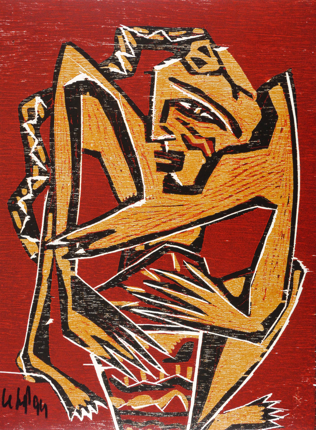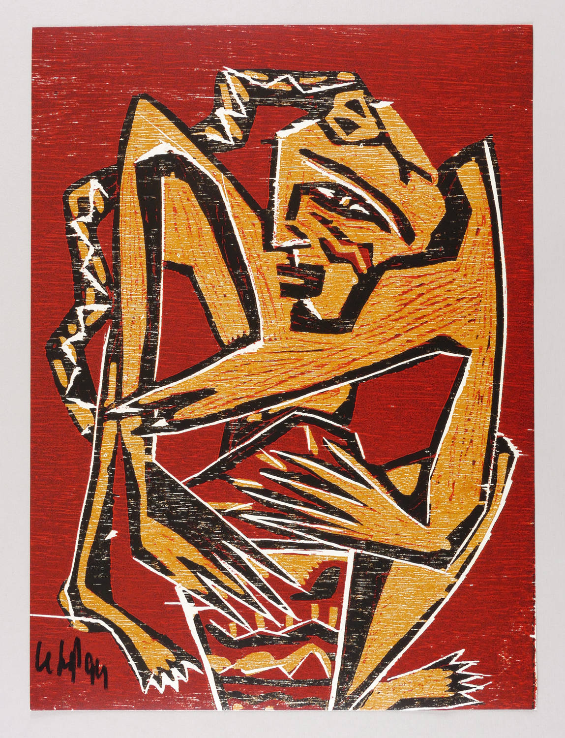 1994. Farbholzschnitt, in Rot, Orange & Schwarz, auf hellchamois Velin. – Von Klaus Süß. – Auflage Exemplar Nr. 22/50. – 49,4 x 36,4 cm (Darstellung / Blatt).