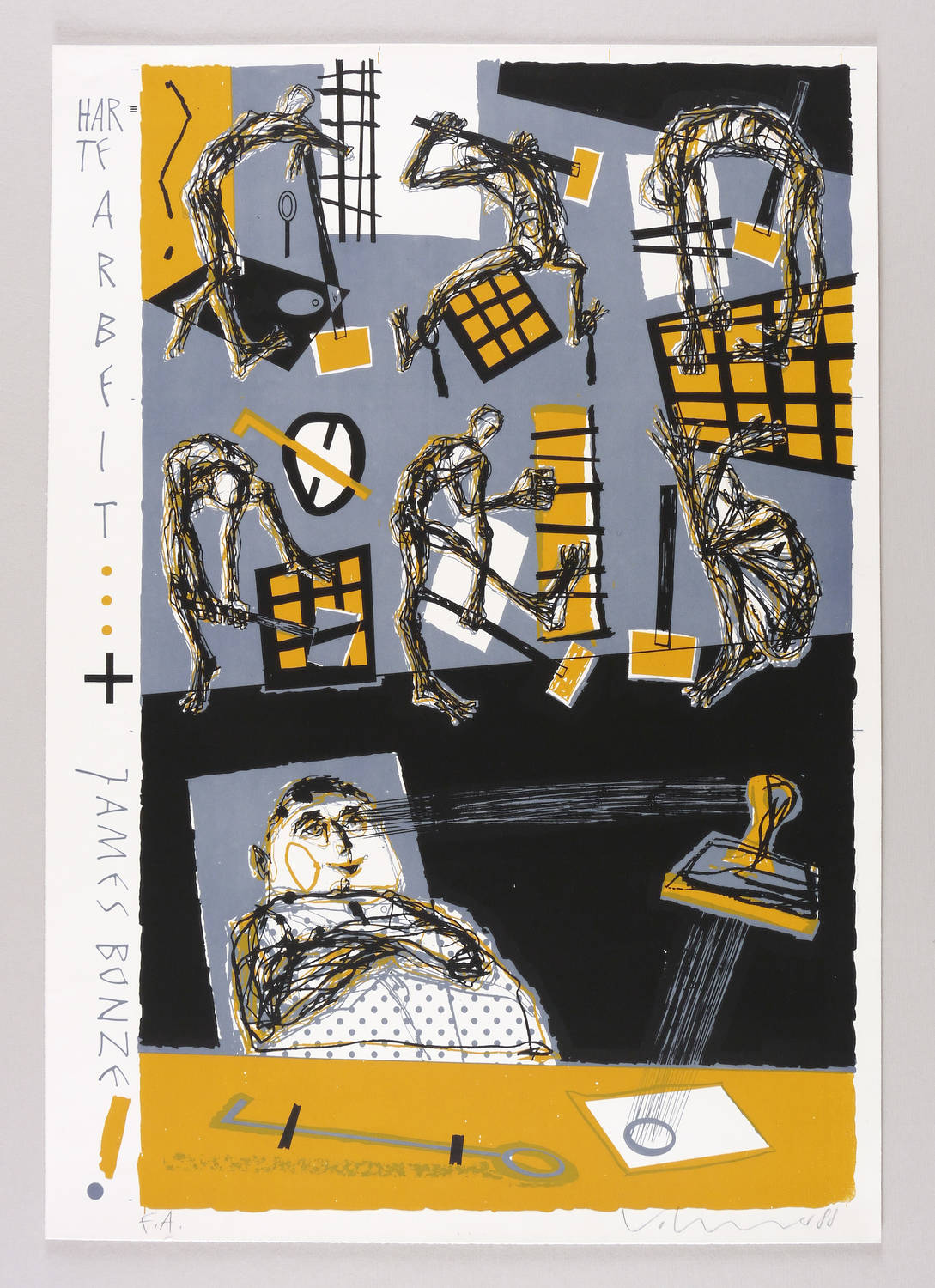 Rechts unten in Bleistift signiert und datiert: ″Volmer 88″. Links Auflagenbezeichnung: ″E.A.″ In der Druckform links Titelinschrift: ″HARTE ARBEIT ... + JAMES BONZE!″ – Tadellos. Sehr guter Zustand.