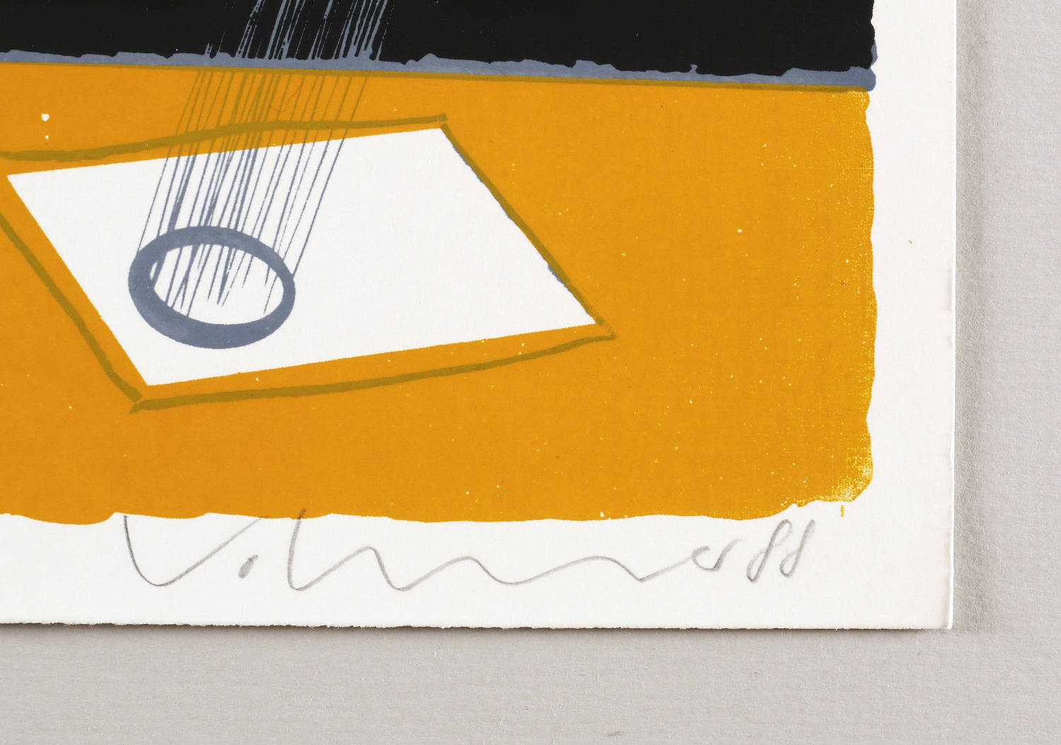 1988. Farbsiebdruck / Farbserigrafie, in 3 Farben, auf glattem hellchamois VelinkartonBütten. – Originale Künstlergrafik, von Steffen Volmer. – Künstlerexemplar (e.a.). – 51,7 x 35,1 cm (Darstellung / Druckbild), 54 x 38 cm (Blatt).