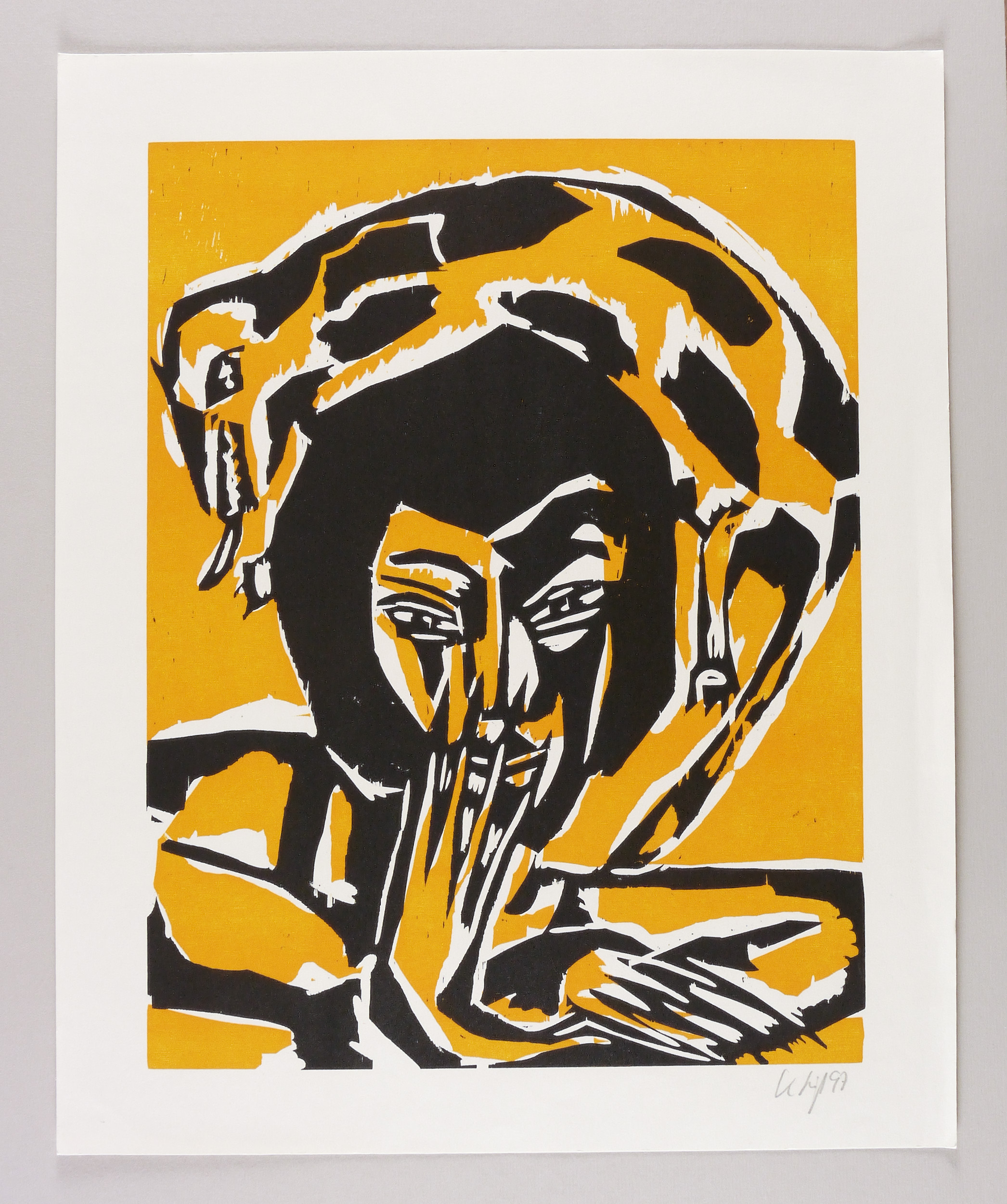 1997. Farbholzschnitt, in Orange-Gelb & Schwarz, auf hellgelbem Velin. – Von Klaus Süß. – 46,1 x 35,5 cm (Darstellung / Druckstock), 55 x 45 cm (Blatt).