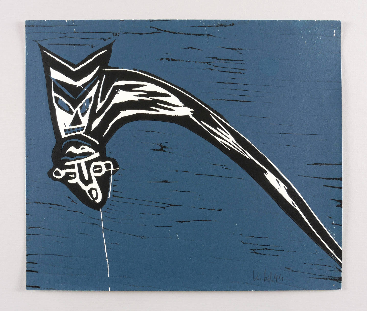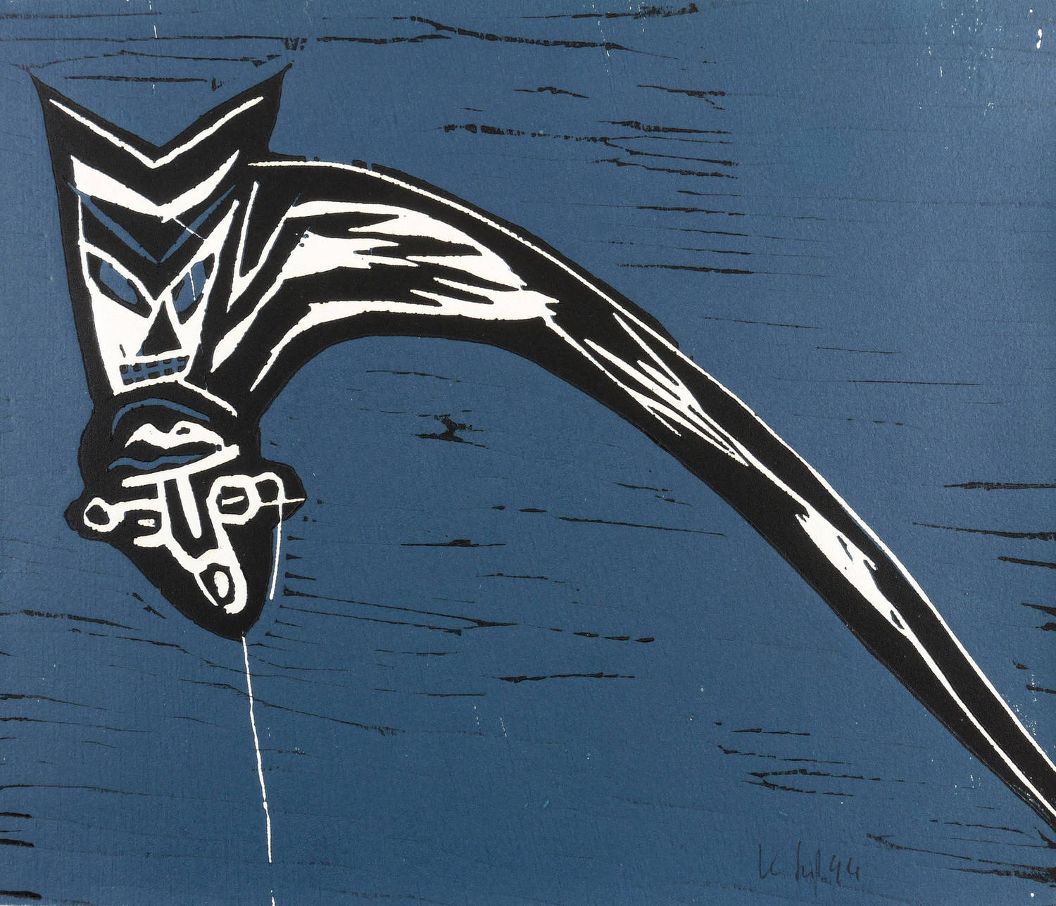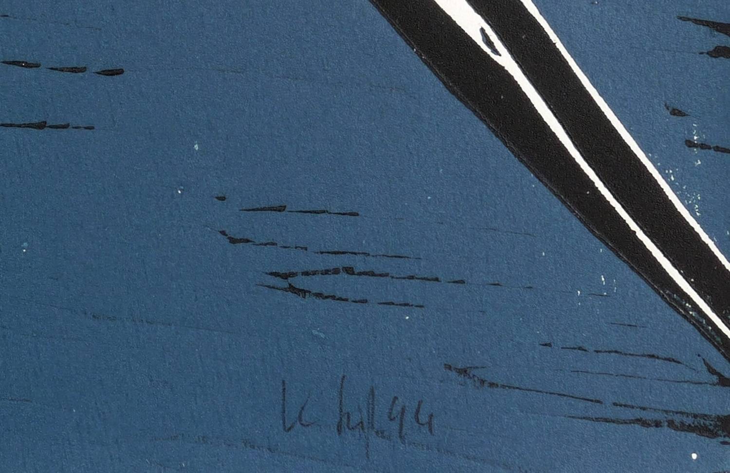1994. Farbholzschnitt, in Dunkelblau & Schwarz, auf starkem Velin. – Von Klaus Süß. – Auflage Exemplar Nr. 22/50. – 27,8 x 32,5 cm (Darstellung / Blatt).