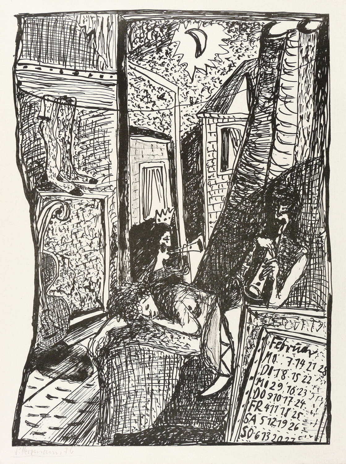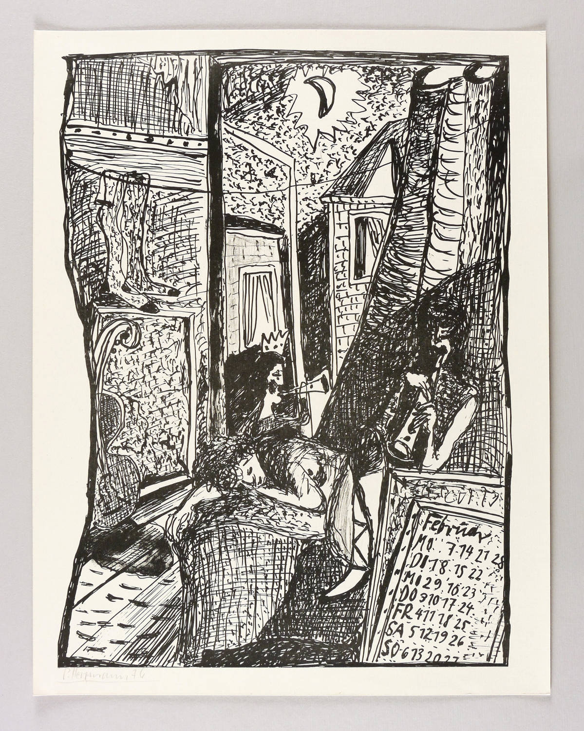1976. Lithografie / Pinsellithografie, in Schwarz, auf hellgelbem Karton. – Originale Künstlergrafik, von Peter Herrmann. – 43,8 x 31,6 cm (Darstellung), 47 x 37 cm (Blatt).