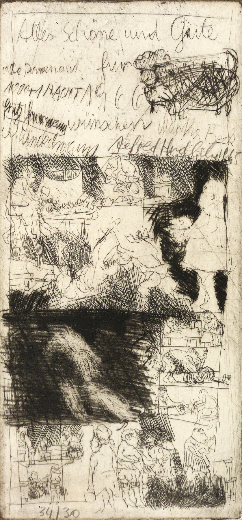1965. Radierung / Strichätzung, Kaltnadel & Roulette, partiell geschabt, in Schwarz, mit Plattenton, auf Velin. – Originale Künstlergrafik, von Alfred Hrdlicka. – Auflage Exemplar Nr. 30/34. – 19,9 x 9,3 cm (Darstellung / Platte), 20,1 x 9,5 cm (Blatt).