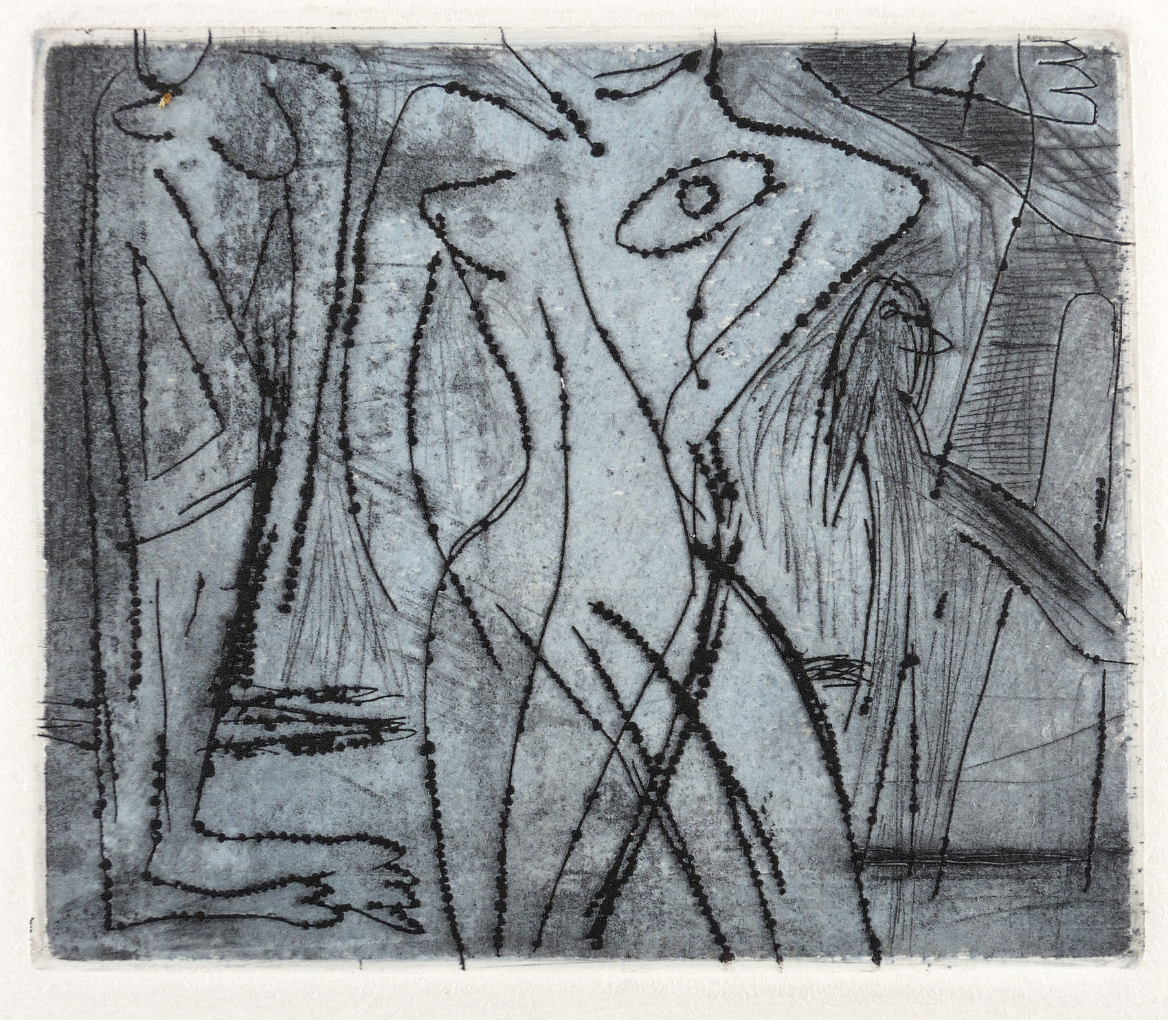 1986. Farbradierung / Aquatinta & Strichätzung, in Blau & Schwarz, auf schwerem hellchamois Velin. – Originale Künstlergrafik, von Veit Hofmann. – Auflage Exemplar Nr. 4/7. – 10,4 x 11,9 cm (Darstellung / Platte), 14,7 x 10,4 cm (Blatt).