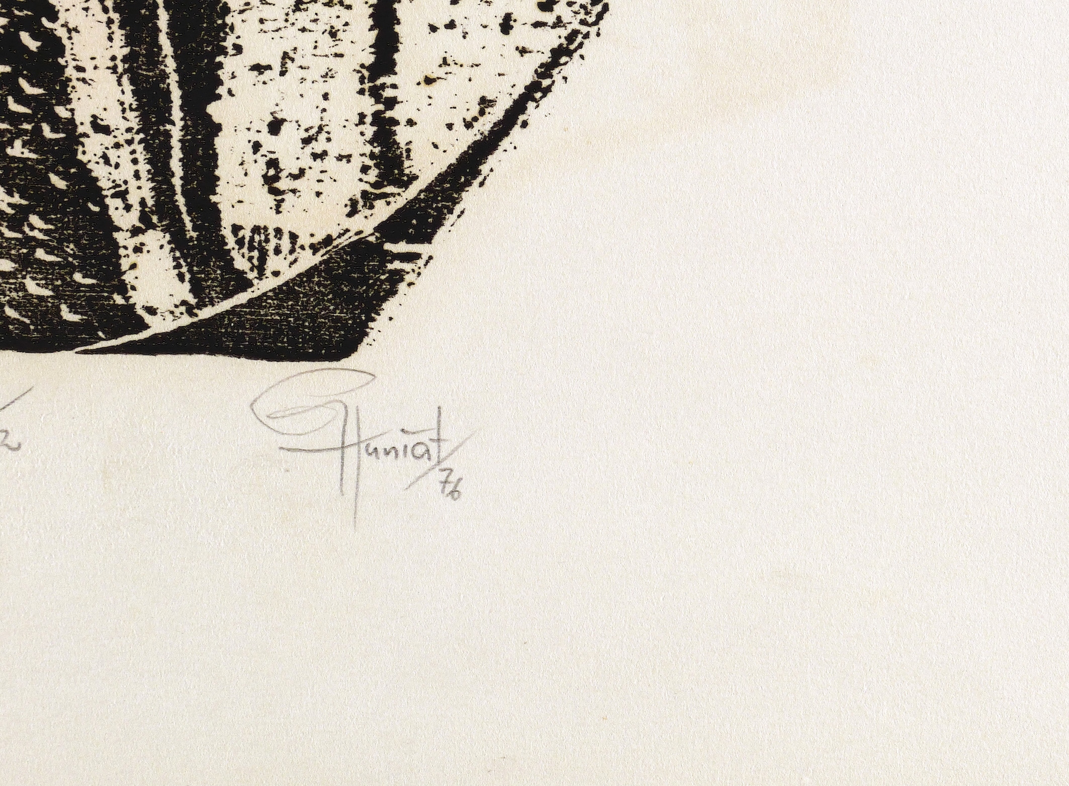Aus: Falko Behrendt u.a., Imagination Format (Dresden: eikon Grafik-Presse 1976). – Rechts unten in Bleistift signiert und datiert: ″GHuniat 76″. Links Titel und Auflagenbezeichnung: ″Formlandinsignie 4/82″. – Leichte Druckstelle im äußersten Rand rechts unten. Sonst guter Zustand.