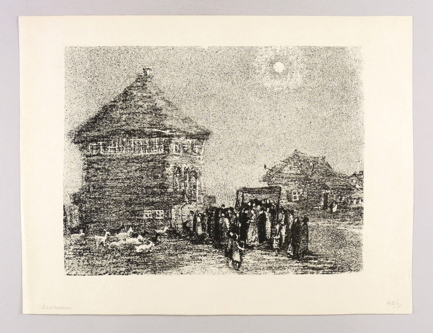 Mayer-Strodt V 25. – Nicht handsigniert. In der linken unteren Blattecke kyrillisch bezeichnet: ″Веичание″. Rechts nummeriert: ″42/31″. – Abzug außerhalb der Auflage von 125 Exemplaren zum lithografischen Mappenwerk ″Tewje, der Milchmann″ zu Scholem Alejchem (Moskau: Sovetskij Chudoznik 1961/1966). Druck wohl in Leningrad. - Die etwas spätere Edition als illustriertes Buch (Dresden: Verlag der Kunst 1967) wurde als ″Schönstes Buch der DDR 1967″ ausgezeichnet. - Seltenes Blatt. – Sehr guter Zustand.
