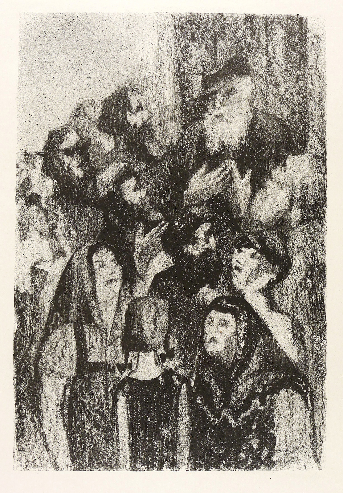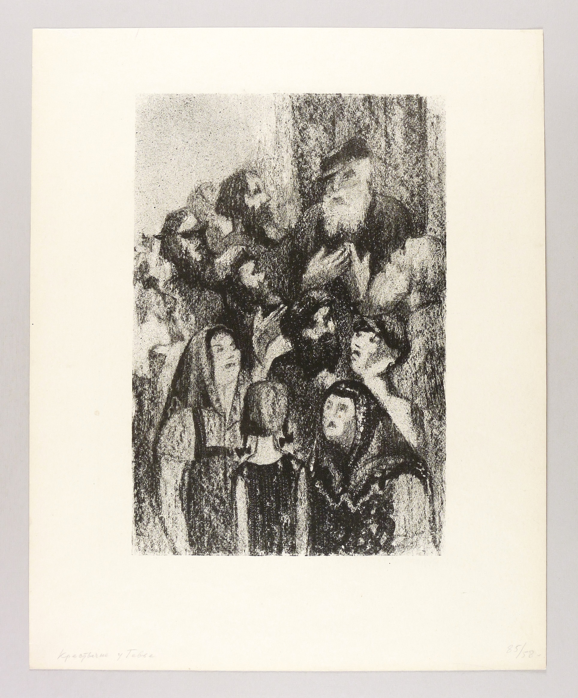 Mayer-Strodt V 90. – Nicht handsigniert. In der linken unteren Blattecke kyrillisch bezeichnet: ″Крестьяне у Тевье″. Rechts nummeriert: ″85/58″. – Abzug außerhalb der Auflage von 125 Exemplaren zum lithografischen Mappenwerk ″Tewje, der Milchmann″ zu Scholem Alejchem (Moskau: Sovetskij Chudoznik 1961/1966). Druck wohl in Leningrad. - Die etwas spätere Edition als illustriertes Buch (Dresden: Verlag der Kunst 1967) wurde als ″Schönstes Buch der DDR 1967″ ausgezeichnet. - Ein Mob sammelt sich vor dem Haus des Tewje und drohen ihm Gewalt und Vertreibung an. – Sehr guter Zustand.