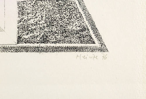 1976. Lithografie / Kreide-, Feder- & Pinsellithografie, in Schwarz, auf leichtem hellgelbem Velinkarton. – Originale Künstlergrafik, von Frieder Heinze. – Auflage Exemplar Nr. 4/70. – 30,7 x 30,1 cm (Darstellung / Druckbild), 49 x 39 cm (Blatt).