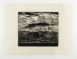 Um 1930. Holzschnitt, in Schwarz, auf wolkigem hellchamois Simili-Japan. – Originale Künstlergrafik, von Ruth Meier. – 23,8 x 28,0 cm (Darstellung / Druckstock), 36 x 49 cm (Blatt).