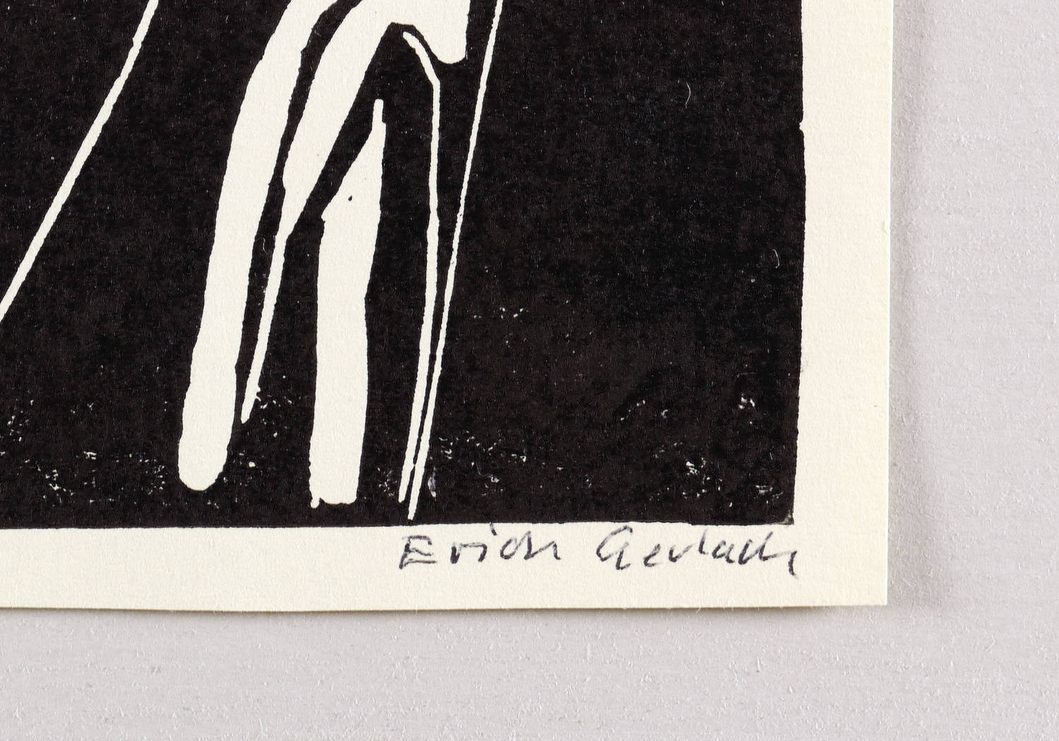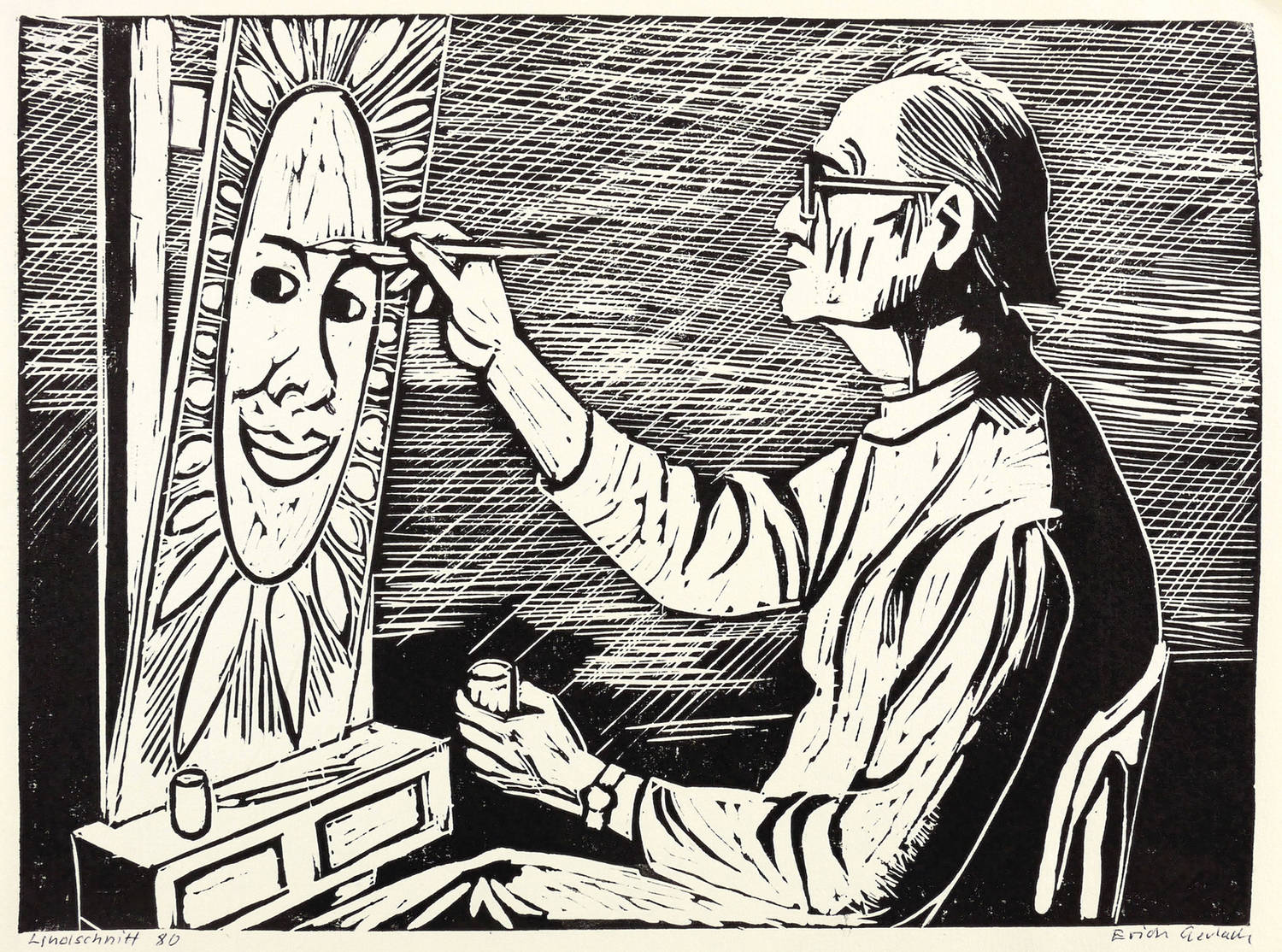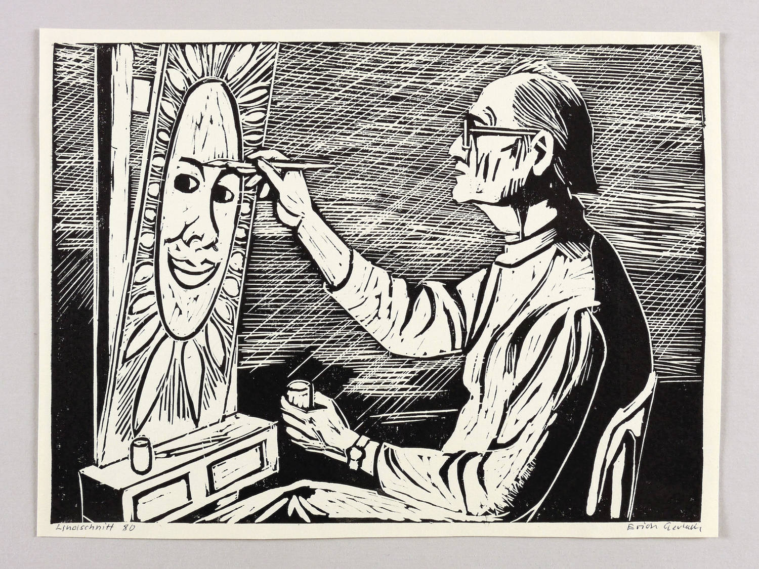 Rechts unten in Kugelschreiber signiert: ″Erich Gerlach″. Links bezeichnet und datiert: ″'Linolschnitt // 80″. Verso von fremder Hand Titel. – Sehr guter Zustand.