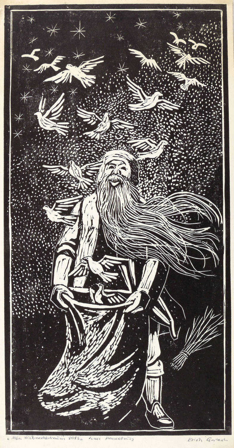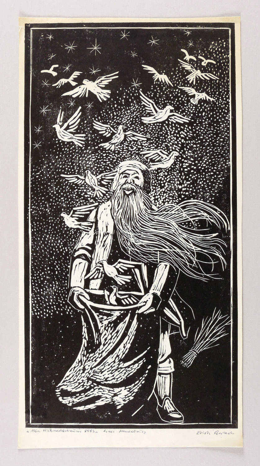 Rechts unten in Kugelschreiber signiert: ″Erich Gerlach″. Links bezeichnet mit Titel, Jahr und Technikbezeichnung: ″Mein Weihnachtstraum 1983 // Linol // Handabzug″. – Sehr guter Zustand.