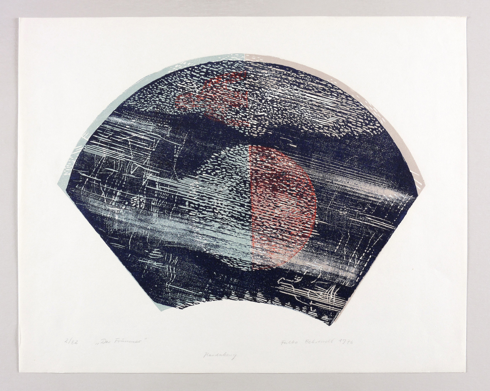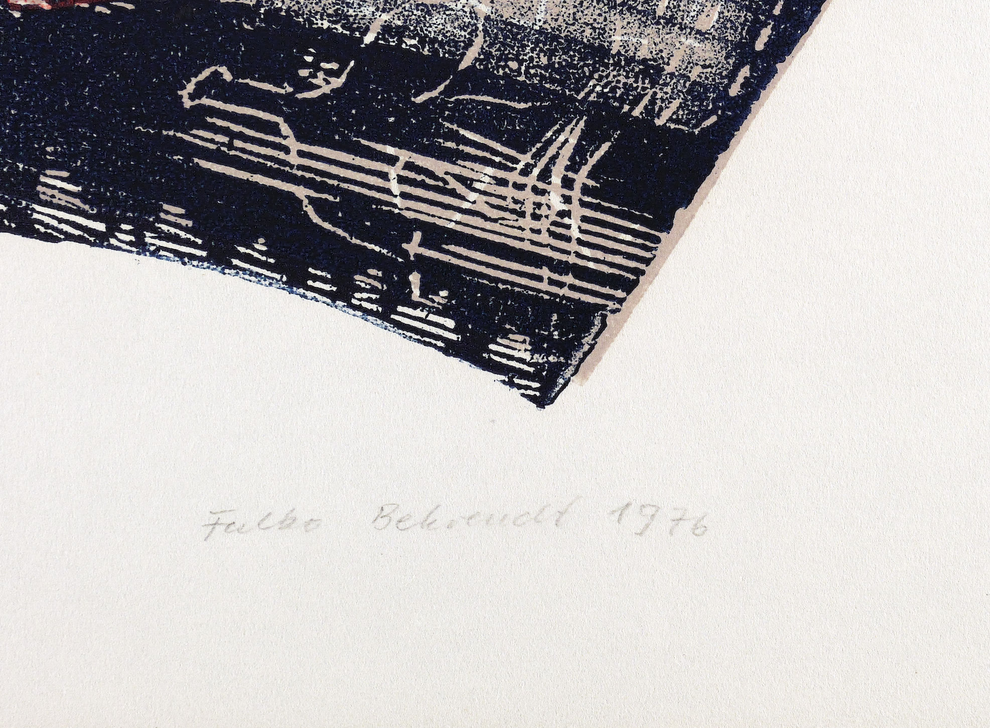 1976. Farbholzschnitt, in 4 Farben, auf rauem weißem Maschinenpapier. – Originale Künstlergrafik, von Falko Behrendt. – Auflage Exemplar Nr. 2/82. – 30,0 x 40,1 cm (Darstellung / Platte), 39 x 49 cm (Blatt).