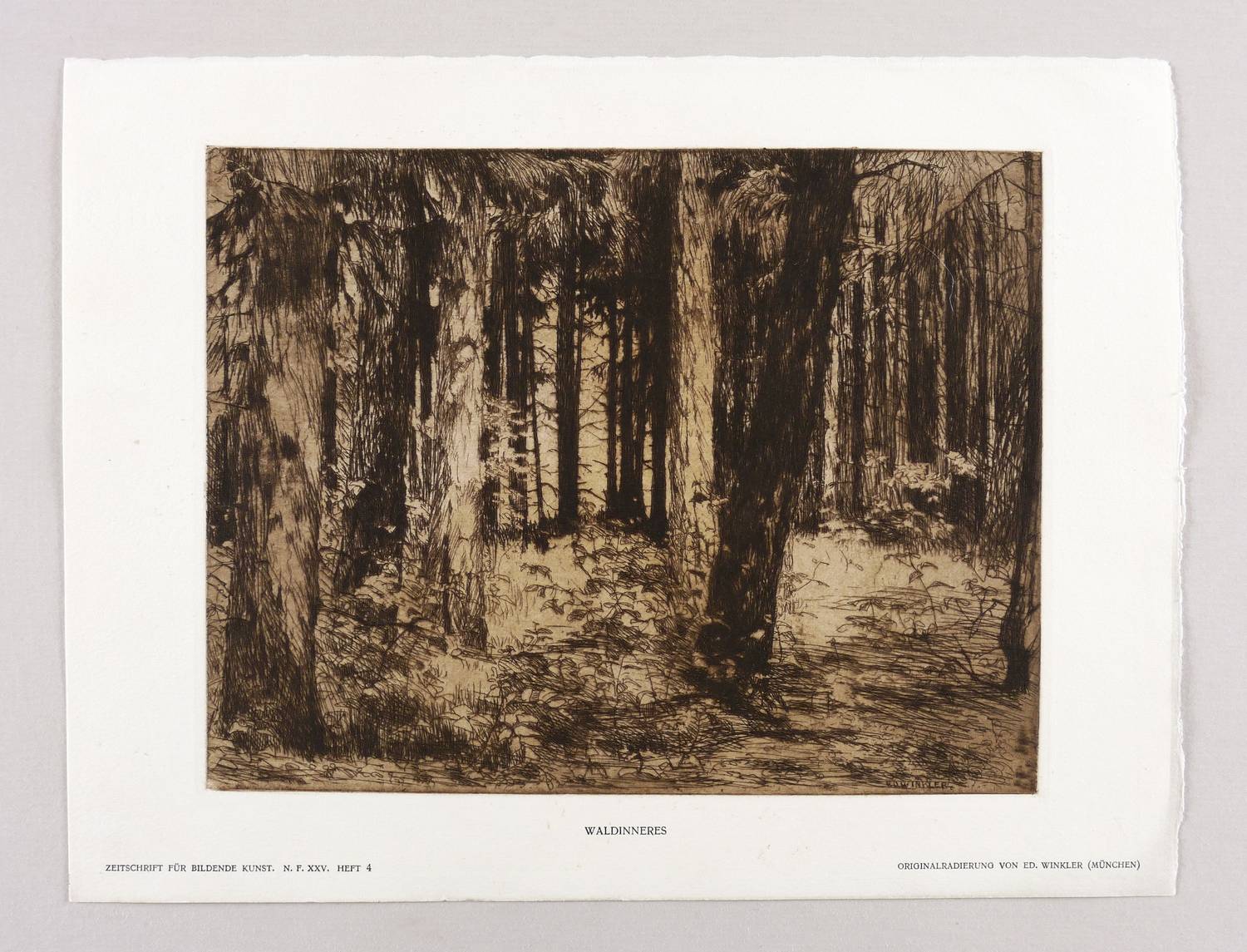 Aus: Zeitschrift für bildende Kunst (Leipzig: E.A. Seemann 1914), Bd. 25. – In der Platte rechts unten signiert: ″ED. WINKLER″. Unterhalb der Darstellung typografisch bezeichnet: ″ORIGINALRADIERUNG VON ED. WINKLER (MÜNCHEN)″. Mittig Titel: ″WALDINNERES″. Angeschnittenes Wasserzeichen. – Sehr guter Zustand.