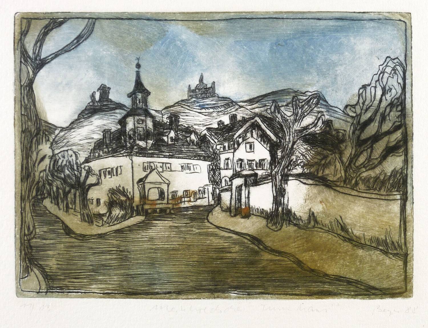 Rechts unten in Bleistift signiert und datiert: ″Beyer 88″. Links Titel: ″Meinholdsches Turmhaus″. – Sehr gut erhalten.
