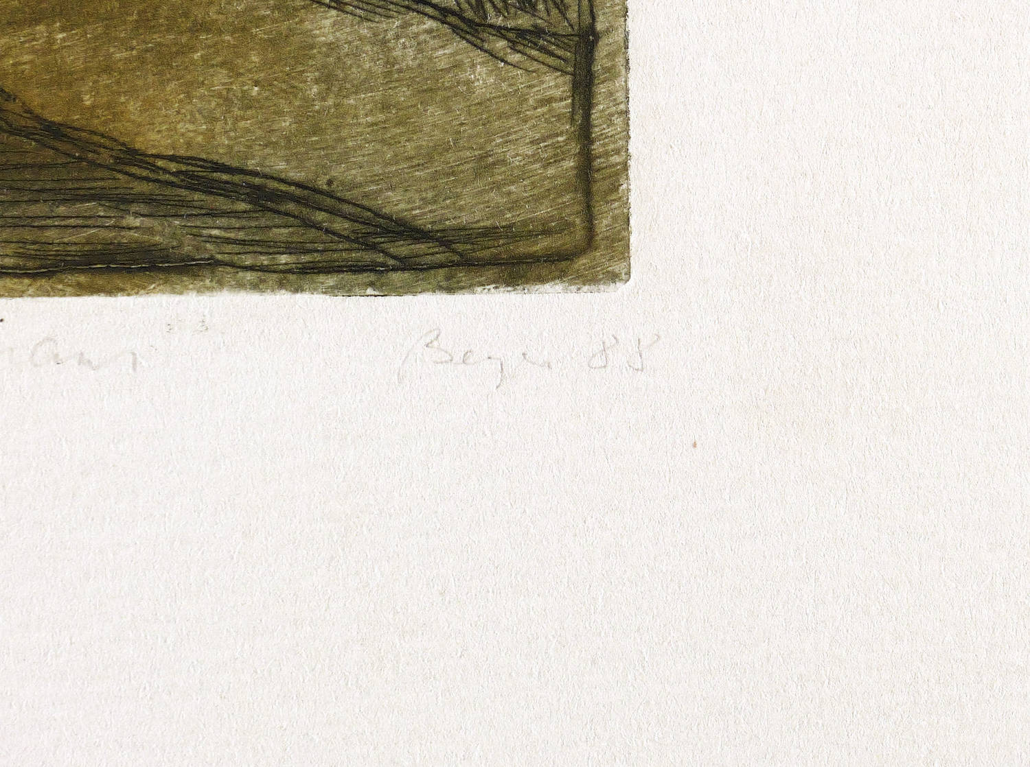 1988. Farbradierung / Strichätzung, in Blau, Grau & Schwarz, auf rauem chamois Velinkarton. – Originale Künstlergrafik, von Manfred Beyer. – AUflage Exemplar Nr. 11/13. – 13,2 x 18,3 cm (Darstellung / Platte), 26 x 38 cm (Blatt).