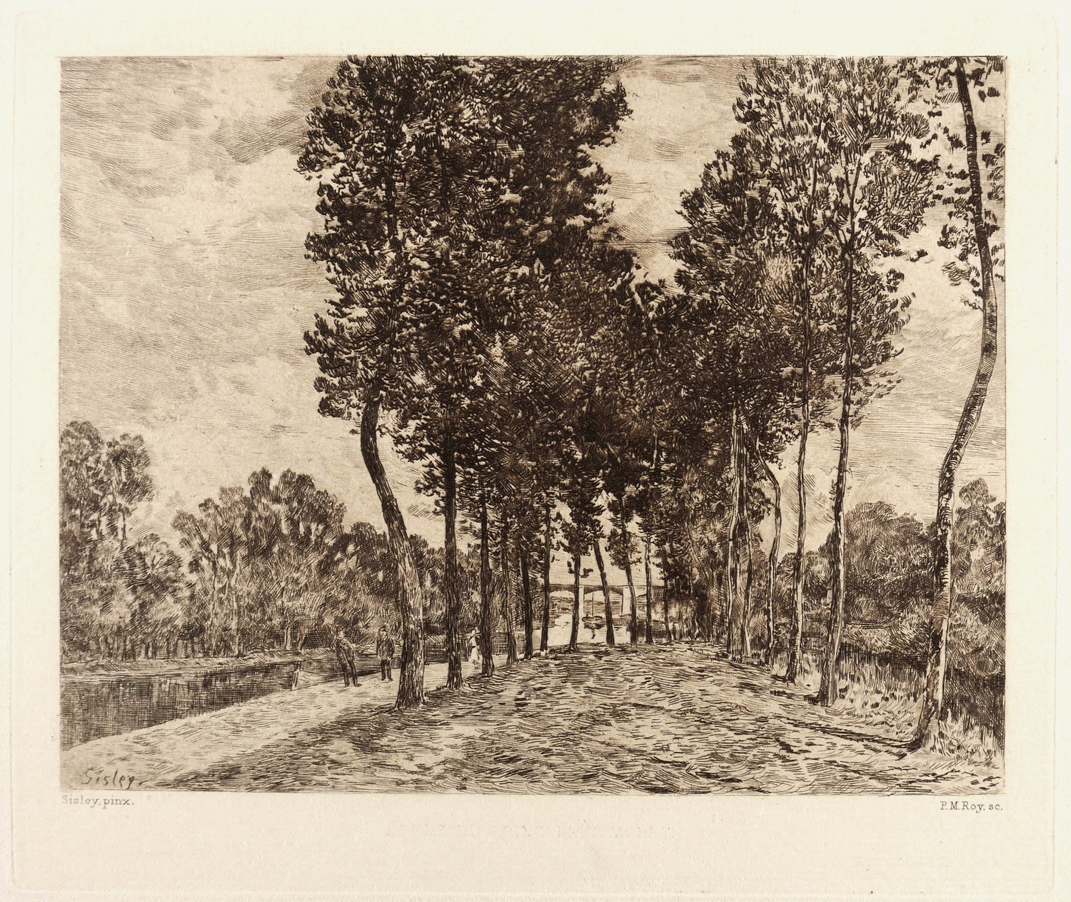 Aus: Théodore Duret, Histoire des peintres impressionnistes. Pissarro, Claude Monet, Sisley, Renoir, Berthe Morisot, Cézanne, Guillaumin (Paris: H. Floury 1906). – In der Platte rechts unten gestochene Signatur: ″P.M. Roy sc.″ Links bezeichnet: ″Sisley pinx.″ Direkt darüber in der Darstellung Wiedergabe der gemalten Signatur: ″Sisley″. – Originalgrafische Beilage. – Hervorragend erhalten. Sehr guter Zustand.