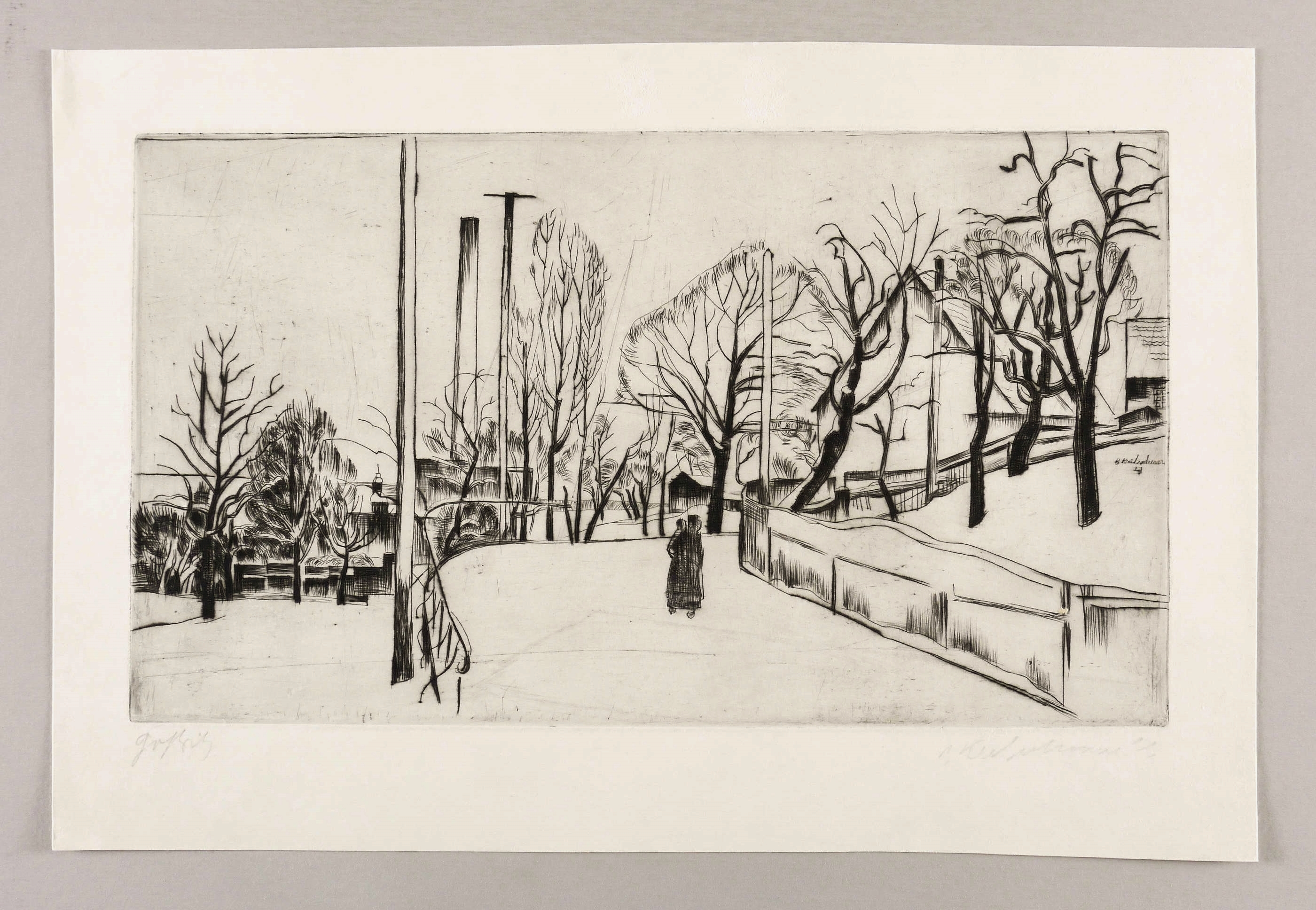 Schmidt-Werner R 130. – Rechts unten in Bleistift signiert und datiert: ″B Kretzschmar 23″. Links Titel: ″Gostritz″. In der Platte im rechten Rand nochmals Signatur und Jahr: ″B. Kretzschmar 23″. – Schönes Exemplar. Guter Zustand.