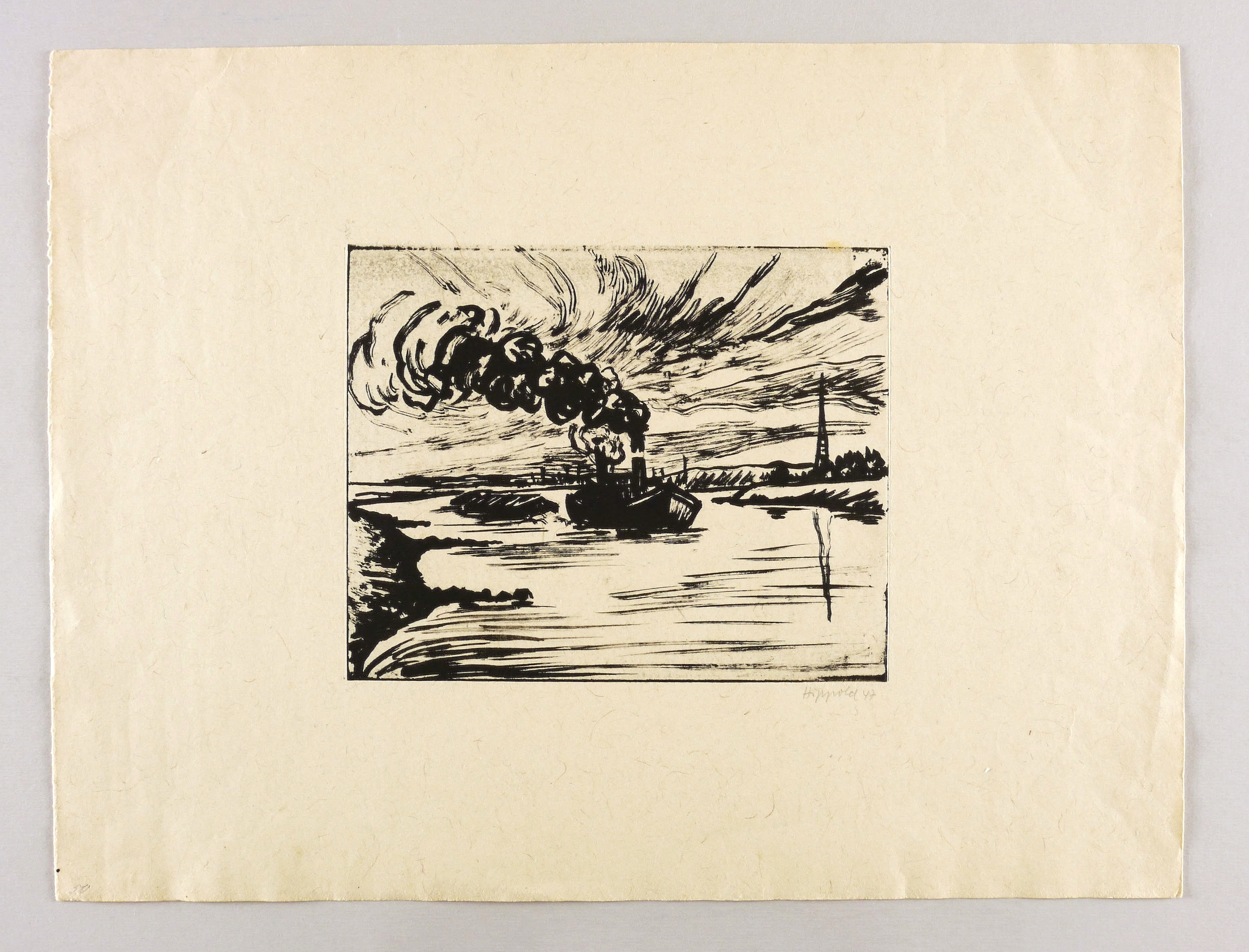 1947. Lithografie / Pinsellithografie, in Schwarz, auf gelbem grobfasrigem Bütten. – Originale Künstlergrafik, von Erhard Hippold. – 20,0 x 24,7 cm (Darstellung / Druckbild), 39 x 52 cm (Blatt).