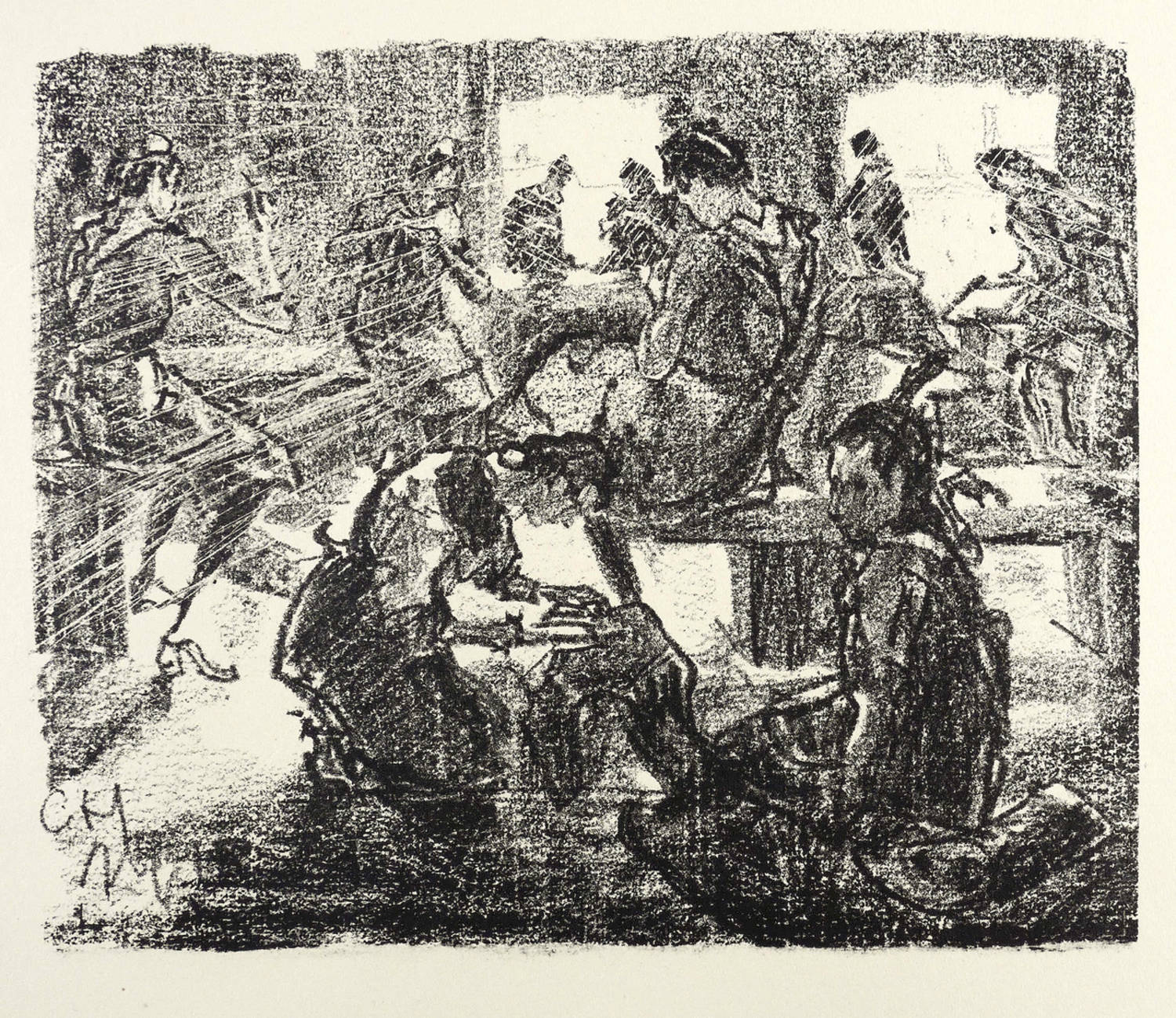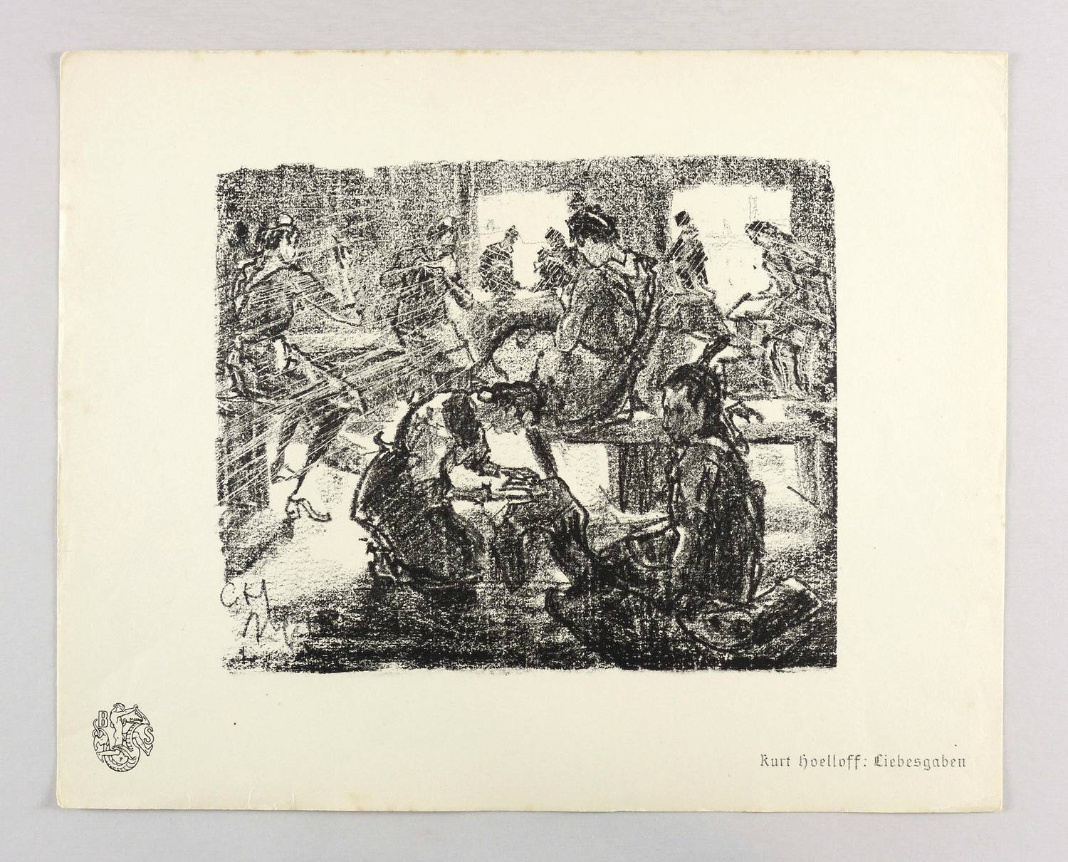 Aus: Krieg und Kunst. Original-Steinzeichnungen der Berliner Sezession (Berlin: Julius Bard 1915). – Nicht handsigniert. Im Stein links unten monogrammiert: ″CH″. Am Blattrand rechts unten typografisch bezeichnet ″Kurt Hoelloff: Liebesgaben″. Links unten Vignette der Berliner Secession. – Papier mit unscheinbaren Altersspuren. Blattkanten leicht bestoßen und minimal fleckig. Insgesamt guter Zustand.