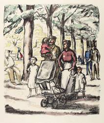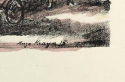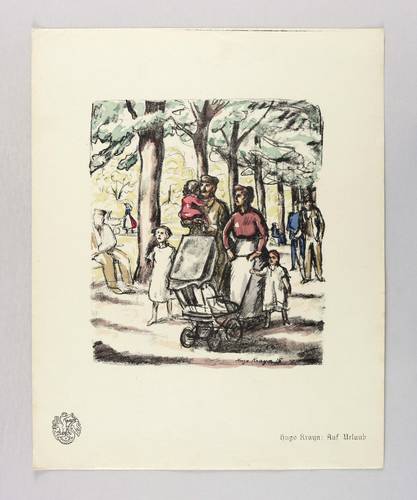 Aus: Krieg und Kunst. Original-Steinzeichnungen der Berliner Sezession (Berlin: Julius Bard 1915). – Nicht handsigniert. Im Stein signiert und datiert unten rechts: ″Hugo Krayn 15″. Außerhalb des Steins typografisch bezeichnet und betitelt unten rechts: ″Hugo Krayn: Auf Urlaub″. Links unten Vignette der Berliner Sezession. – Originalrandiges Exemplar. Papier etwas gegilbt. Unauffällige Altersspuren. Ecken leicht bestoßen. Guter Zustand.