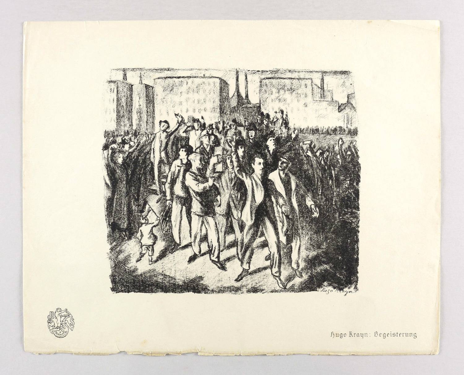 Aus: Krieg und Kunst. Original-Steinzeichnungen der Berliner Sezession (Berlin: Julius Bard 1916). – Nicht handsigniert. Im Stein signiert und datiert unten rechts: ″Hugo Krayn 15″. Außerhalb des Steins typografisch bezeichnet und betitelt unten rechts: ″Hugo Krayn: Begeisterung″. Links unten Vignette der Berliner Sezession. – Originalrandiges Exemplar. Papier etwas gegilbt. Stärkere Randmängel, Blattkante unten etwas brüchig, links kleiner Randriss hinterlegt, rechts oben Eselsohr. Ecken bestoßen. Mangelhafter bis mäßig guter Zustand.