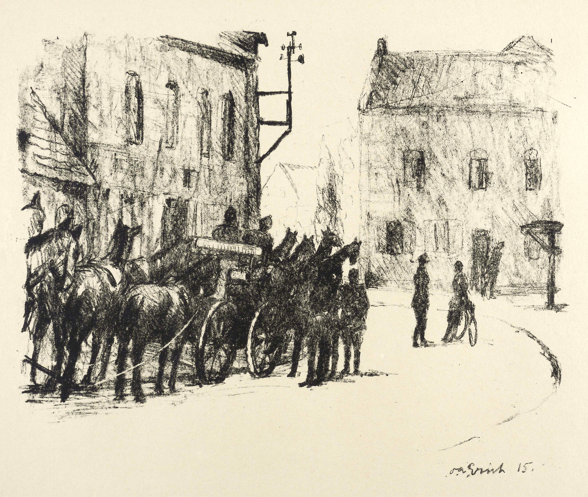 Aus: Krieg und Kunst. Original-Steinzeichnungen der Berliner Sezession (Berlin: Julius Bard 1915). – Nicht handsigniert. Im Stein rechts unten signiert und datiert: ″O.A. Erich 15.″ Im Blattrand rechts unten typografisch bezeichnet: ″Oswald Erich: Artilleriekolonne″. Links unten Vignette der Berliner Secession. – Papier mit leichten Randmängeln. Blattkanten leicht gegilbt, bestoßen und minimal fleckig. Insgesamt mäßig guter Zustand.
