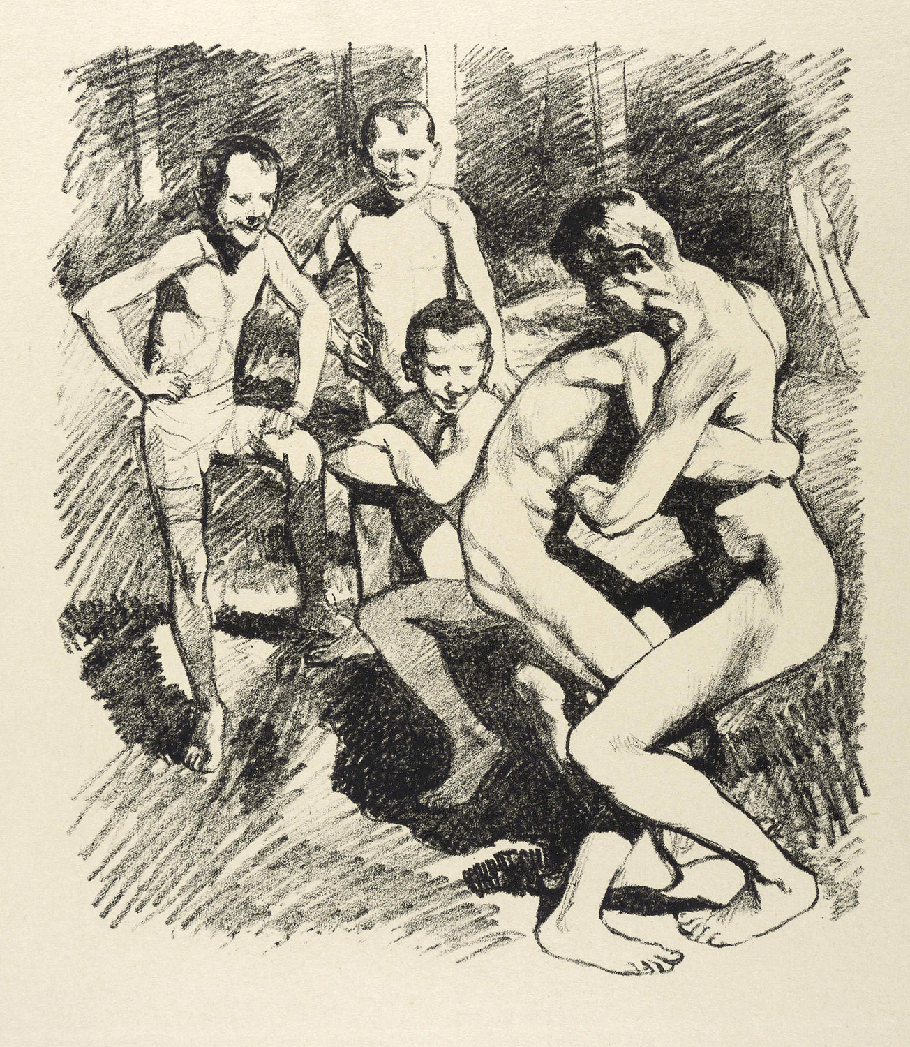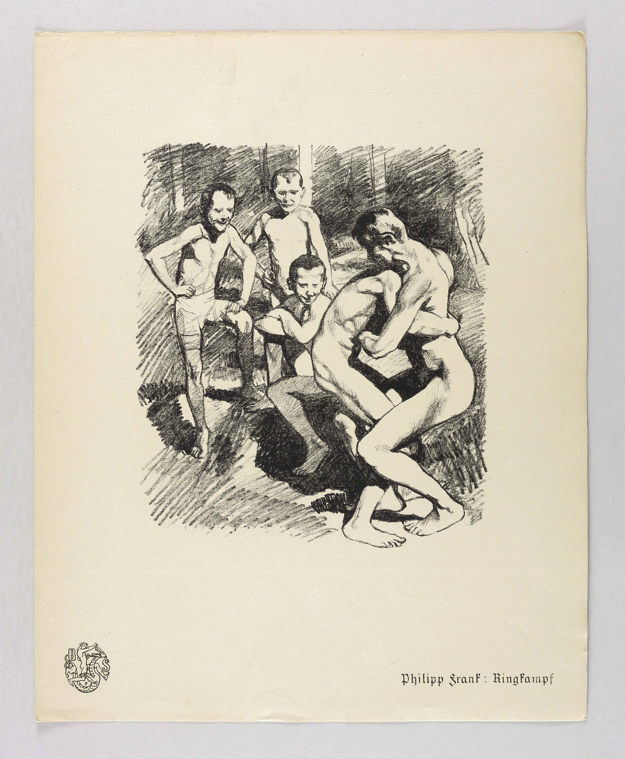 Söhn IV 43220-3. – Aus: Krieg und Kunst. Original-Steinzeichnungen der Berliner Sezession (Berlin: Julius Bard 1915). – Nicht handsigniert. Im Blattrand rechts unten typografisch bezeichnet ″Philipp Frank: Ringkampf″. Links unten Vignette der Berliner Secession. – Unscheinbare Randmängel und Altersspuren. Guter Zustand.