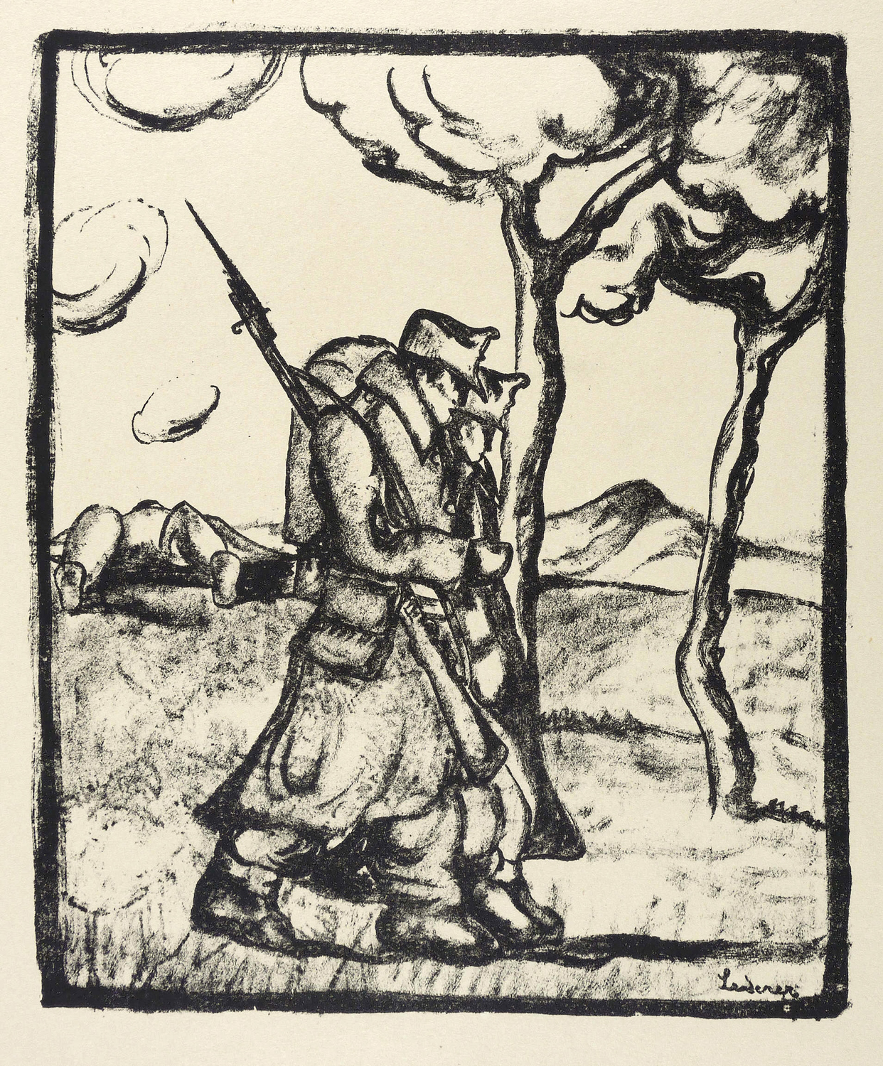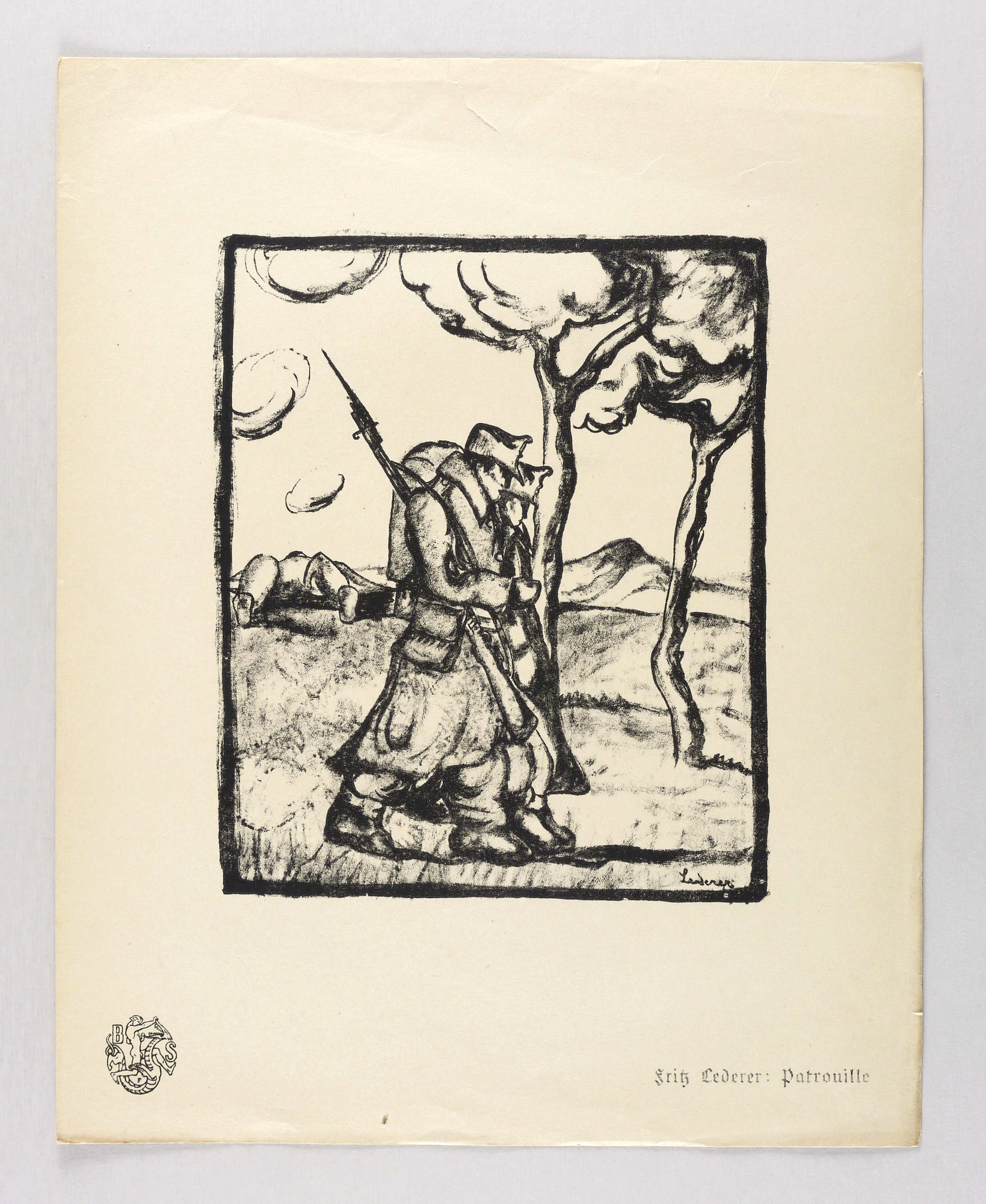 Aus: Krieg und Kunst. Original-Steinzeichnungen der Berliner Sezession (Berlin: Julius Bard 1915-1918). – Nicht handsigniert. Im Stein rechts unten signiert: ″Lederer″. Am Blattrand rechts unten typografisch bezeichnet: ″Fritz Lederer: Patrouille″. Links unten Vignette der Berliner Secession. – Papier mit Altersspuren. Blattränder leicht bestoßen und knickspurig. Im oberen Rand zwei Risse hinterlegt. Mangelhafter bis mäßiger Zustand.