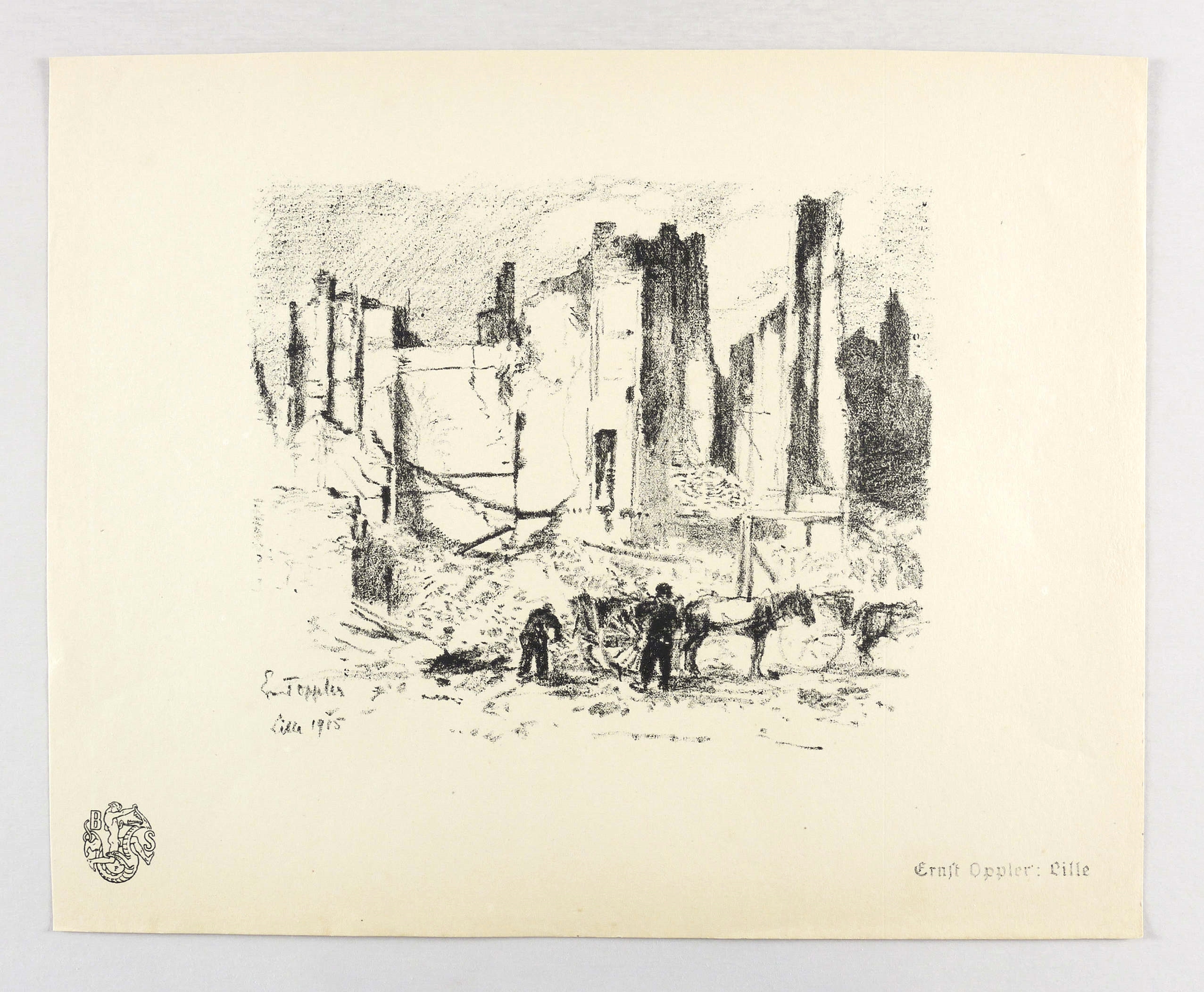 Aus: Krieg und Kunst. Original-Steinzeichnungen der Berliner Sezession (Berlin: Julius Bard 1915). – Nicht handsigniert. Im Stein links unten signiert und datiert: ″E. Oppler / Lille 1915″. Im Blattrand rechts unten typografisch bezeichnet: ″Ernst Oppler: Lille″. Links unten Vignette der Berliner Secession. – Originalrandiges Exemplar. Leichte Randmängel, Blattkanten geringfügig knickspurig. Papier altersbedingt leicht gegilbt. Guter Zustand.