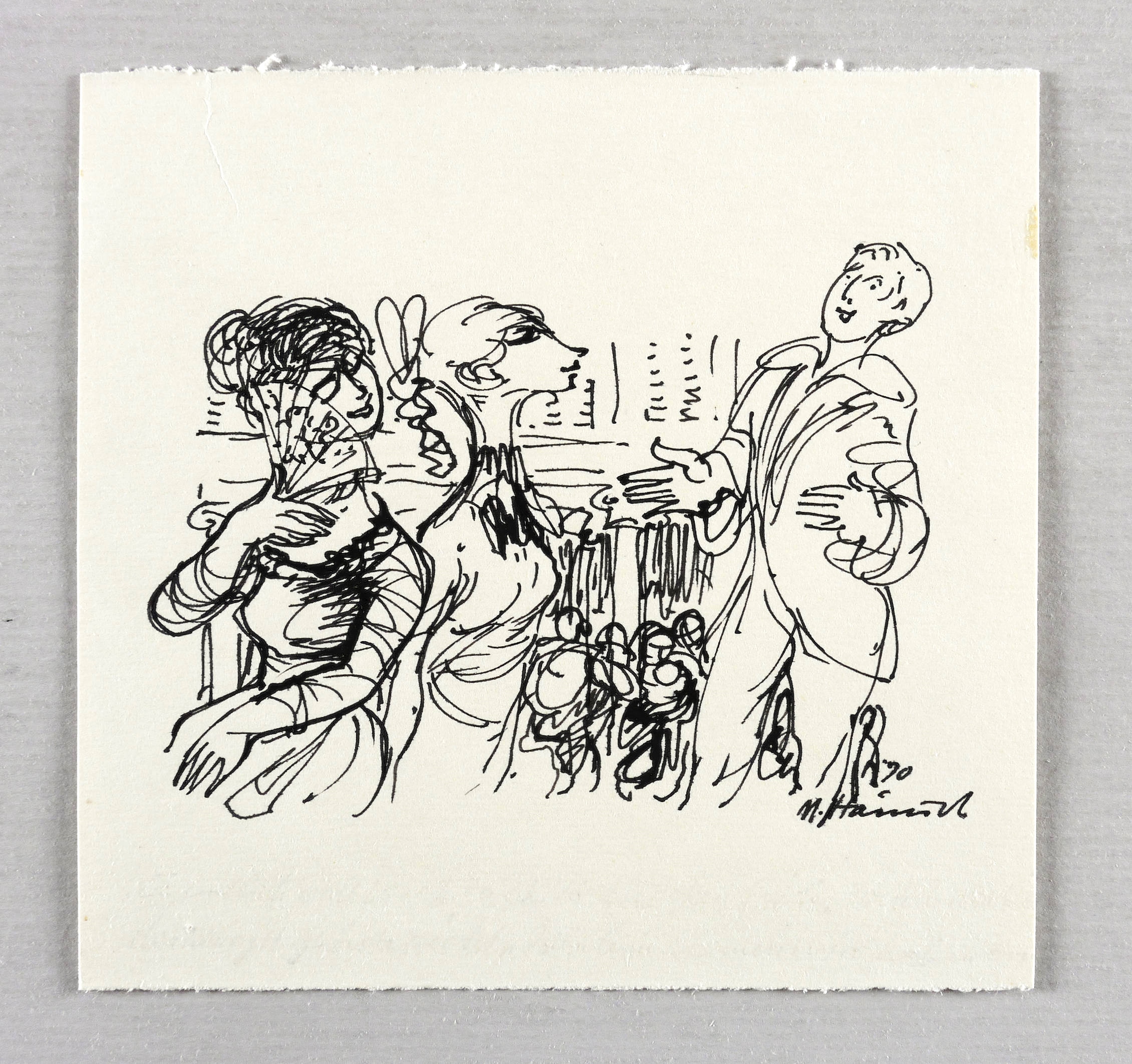 1970. Zeichnung / Federzeichnung, in schwarzer Tusche, auf hellchamois Velinkarton. – Originale Künstlergrafik, von Martin Hänisch. – Unikat. – 12,0 x 12,5 cm (Blatt), 7,5 x 10,2 cm (Darstellung).