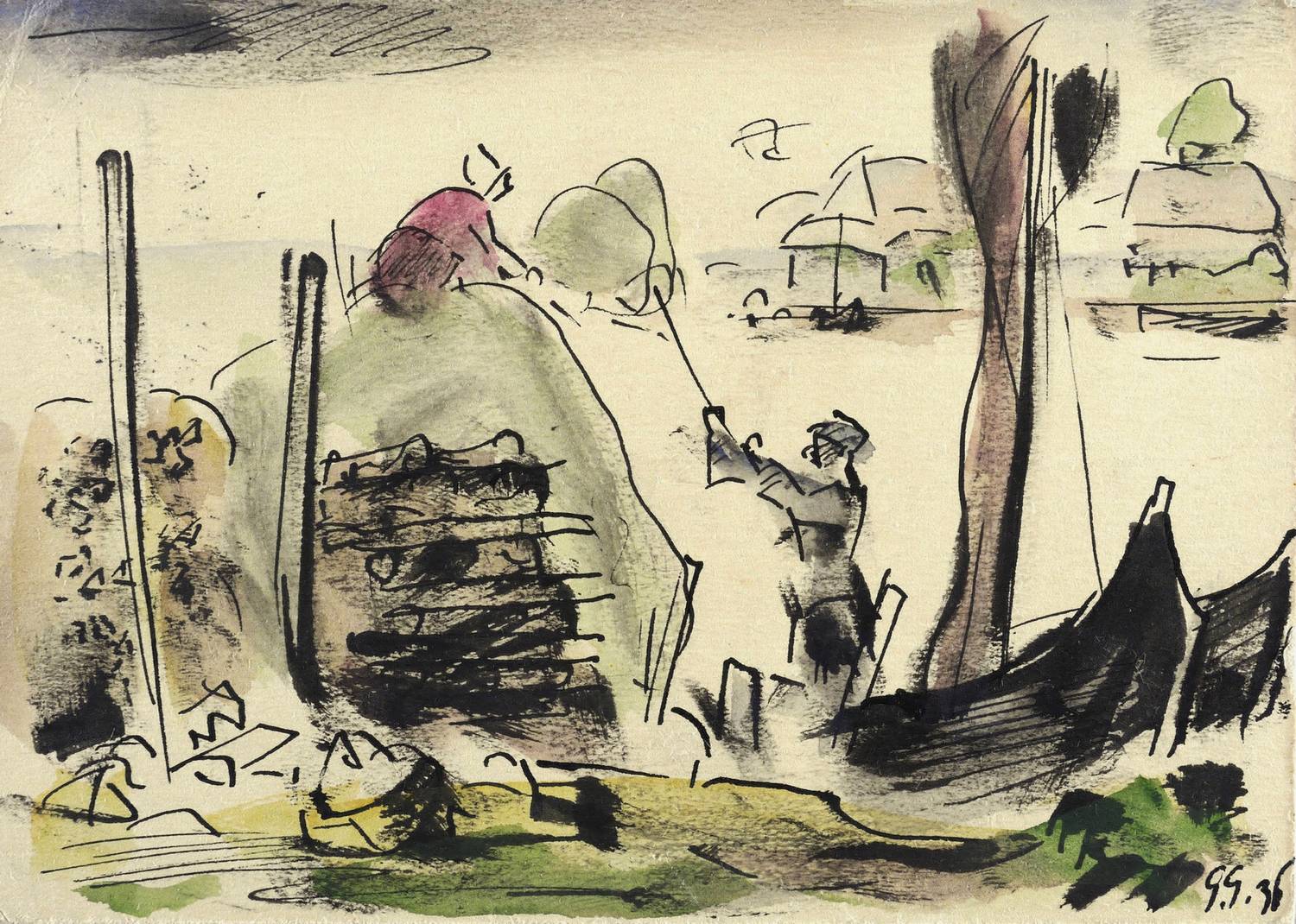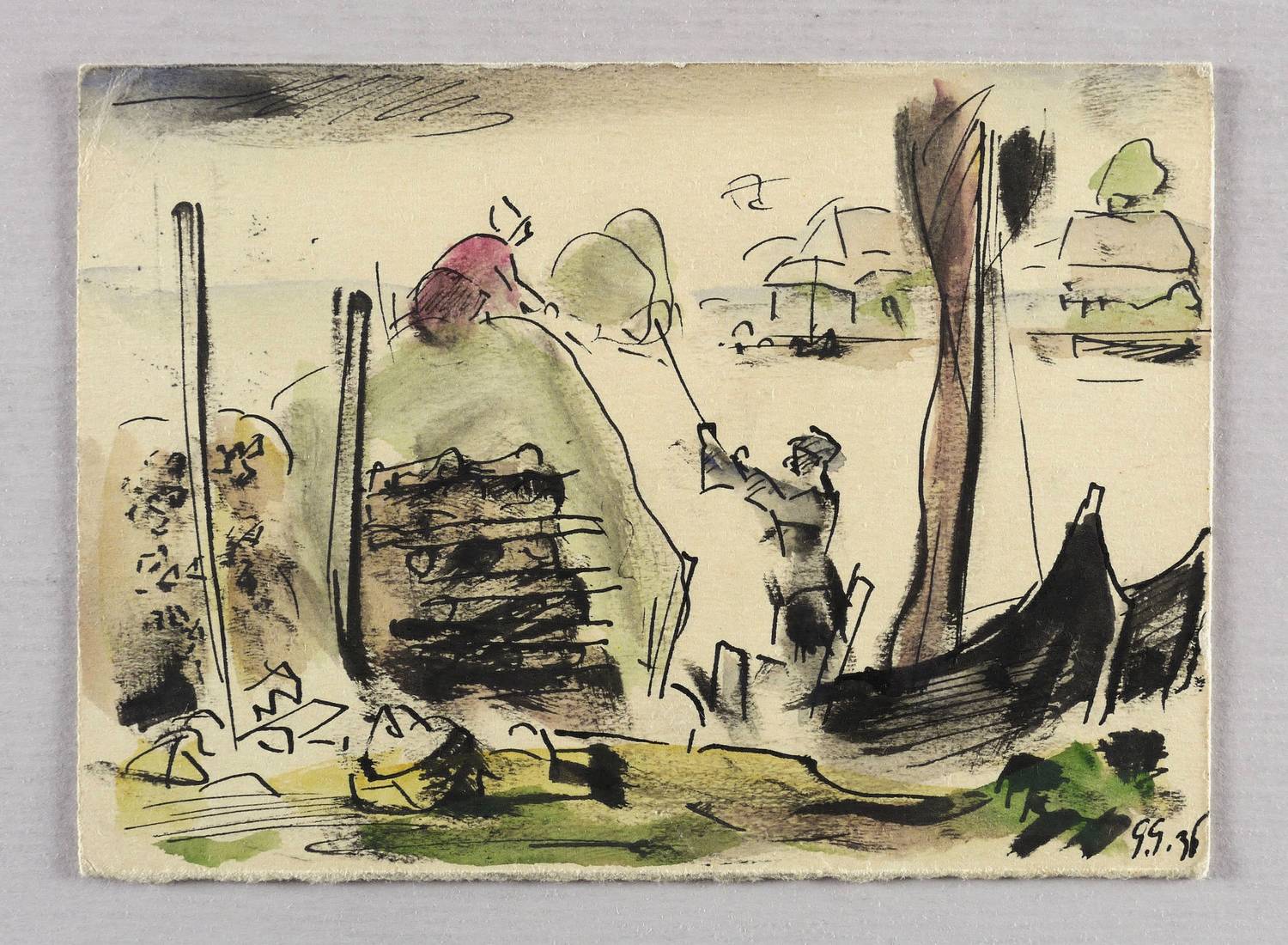 1936. Aquarell, über Feder & schwarzer Tusche, auf Postkarten-Karton. – Originale Künstlergrafik, von Georg Gelbke. – Unikat. – 10,5 x 14,6 cm (Darstellung / Blatt).