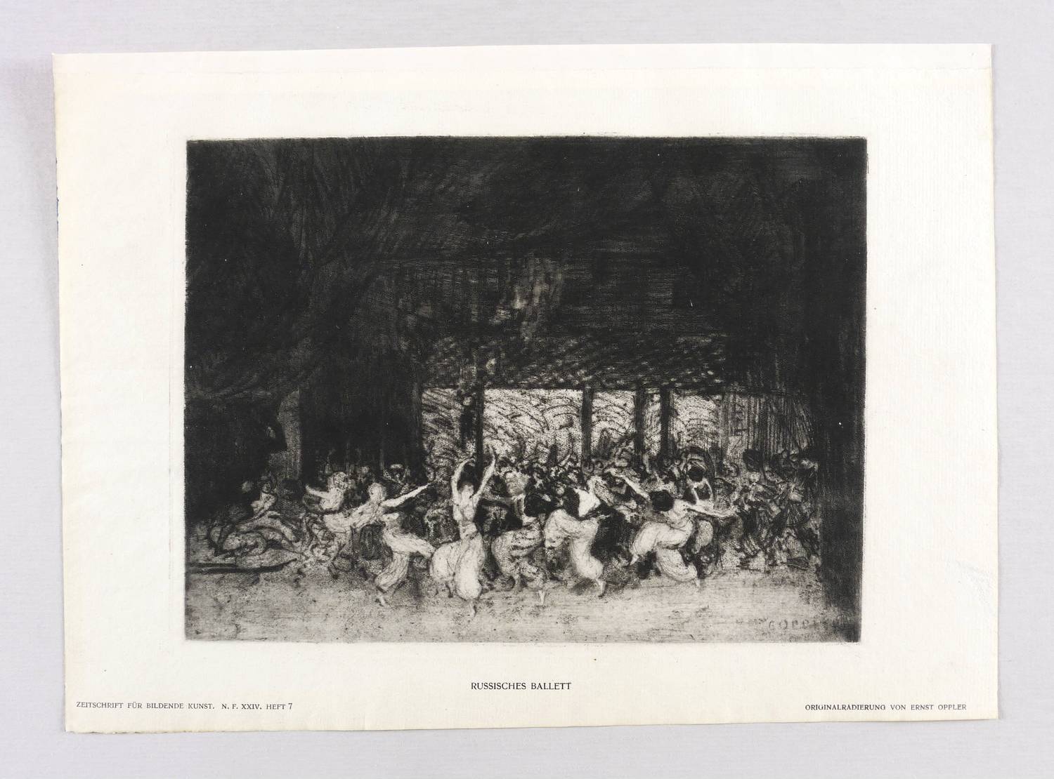 Bruns D-527-33. – Aus: Zeitschrift für bildende Kunst (Leipzig: E.A. Seemann 1913), Bd. 24. – Nicht handsigniert. In der Platte rechts unten signiert: ″E. OPPLER″. Unterhalb der Darstellung typografisch bezeichnet: ″RUSSISCHES BALLETT. // ORIGINALRADIERUNG VON ERNST OPPLER″. Links Bandangabe. – Sehr guter Zustand.