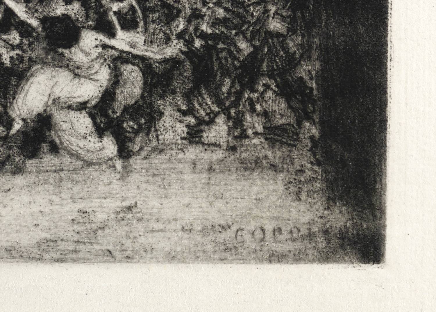1913. Radierung / Vernis mou & Kaltnadel, in Schwarz, auf hellgelbem Van-Gelder-Zonen. – Originale Künstlergrafik, von Ernst Oppler. – 17,7 x 23,8 cm (Darstellung / Druckbild), 24 x 33 cm (Blatt), 18,5 x 24,8 cm (Platte).