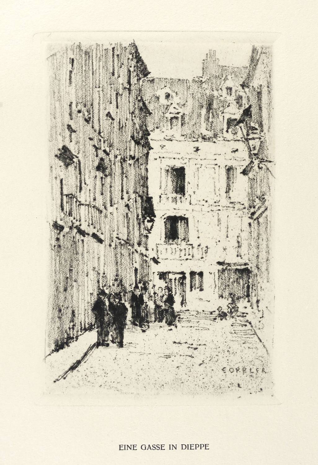 1913. Radierung / Vernis mou, in Schwarz, auf gelbem Velinkarton. – Originale Künstlergrafik, von Ernst Oppler. – 17,7 x 23,8 cm (Darstellung / Druckbild), 24 x 33 cm (Blatt), 18,5 x 24,8 cm (Platte).