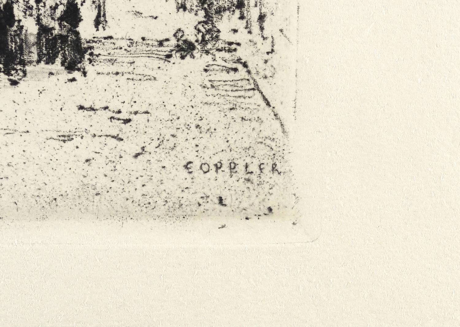 Ernst Oppler (1867 Hannover - 1929 Berlin). Deutsch-jüdischer Maler und Grafiker. Namhafter Vertreter des deutschen Impressionismus. Ab 1886 Studium an der Münchner Akademie bei Nikolaus Gysis, Ludwig von Löfftz und Karl Raupp. Daneben Unterricht an der privaten Zeichenschule von Heinrich Knirr. Ging 1894 nach London, um nach James McNeill Whistler das Radieren zu erlernen. 1895 Mitglied der Münchener Secession. 1898 Gründungsmitglied der Berliner Secession und Mitglied der International Society of Sculptors, Painters and Graversv in London. Ab 1901 im niederländischen Dorf Sluis, wo er eine farbintensive Lichtmalerei entwickelte. Ab 1904 auf Empfehlung von Paul Baum in Berlin. Freundschaft mit Max Liebermann und Lovis Corinth. Ab 1912 Radierungen zum Russischen Ballett.