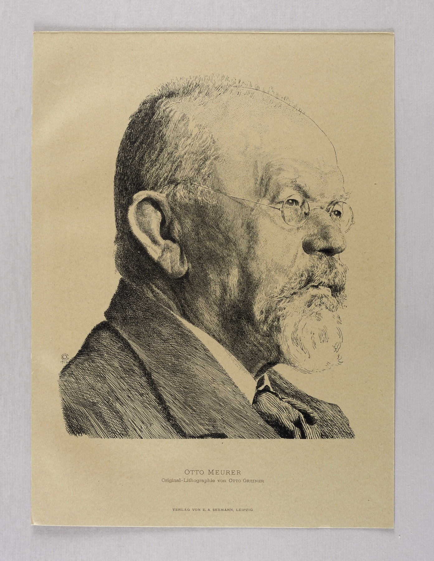 Vogel 102. – Aus: Zeitschrift für bildende Kunst (Leipzig: E.A. Seemann 1914), Bd. 25. – Nicht handsigniert. Im Stein links unten Monogramm und Jahr: ″OG 1914″. Unterhalb typografisch bezeichnet: ″OTTO MEURER / Original- Lithographie von OTTO GREINER″. Darunter Verlagsadresse E.A. Seemann Leipzig. Auf dem beigegebenen Korrektur-Zettel Berichtigung des Vornamens von Prof. Moritz Meurer. – Abzug vom originalen Stein. - Originalgrafische Beilage des Jahrgangs 1914 der Zeitschrift für Bildende Kunst. – Tadellos. Sehr guter Zustand.