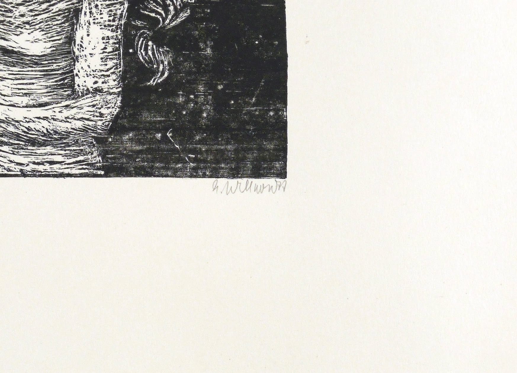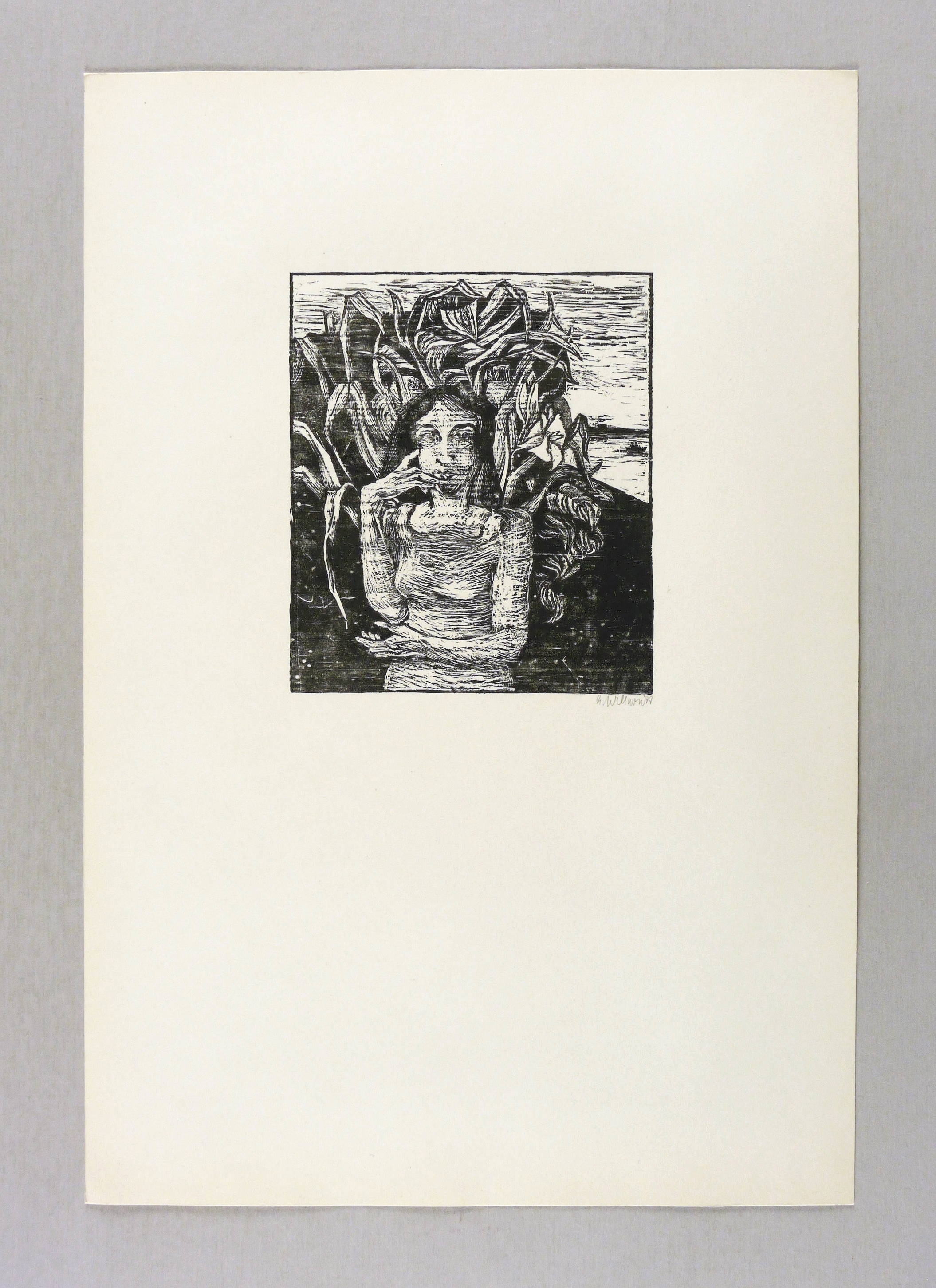 1977. Holzriss / Holzriß, in Schwarz, auf glattem gelblichem Velinkarton. – Originale Künstlergrafik, von Ellen Willnow. – 14,3 x 12,3 cm (Darstellung / Druckstock), 39 x 27 cm (Blatt).