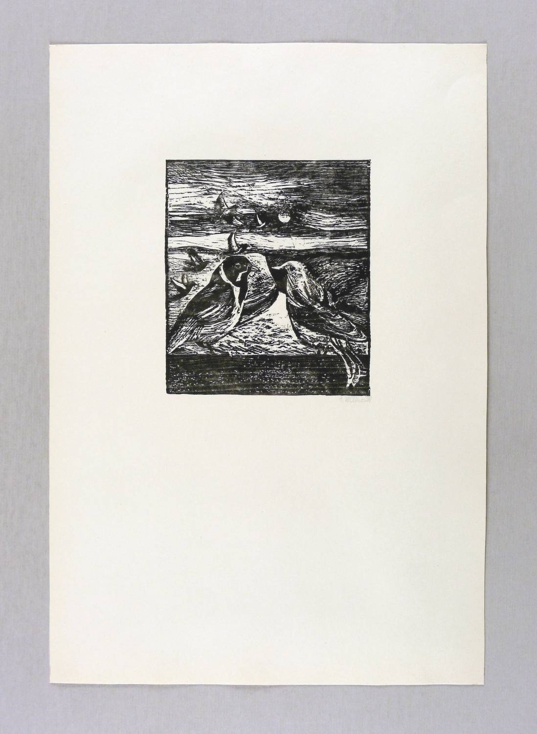 1977. Holzriss / Holzriß, in Schwarz, auf glattem gelblichem Velinkarton. – Originale Künstlergrafik, von Ellen Willnow. – 14,2 x 12,4 cm (Darstellung / Druckstock), 39 x 27 cm (Blatt).