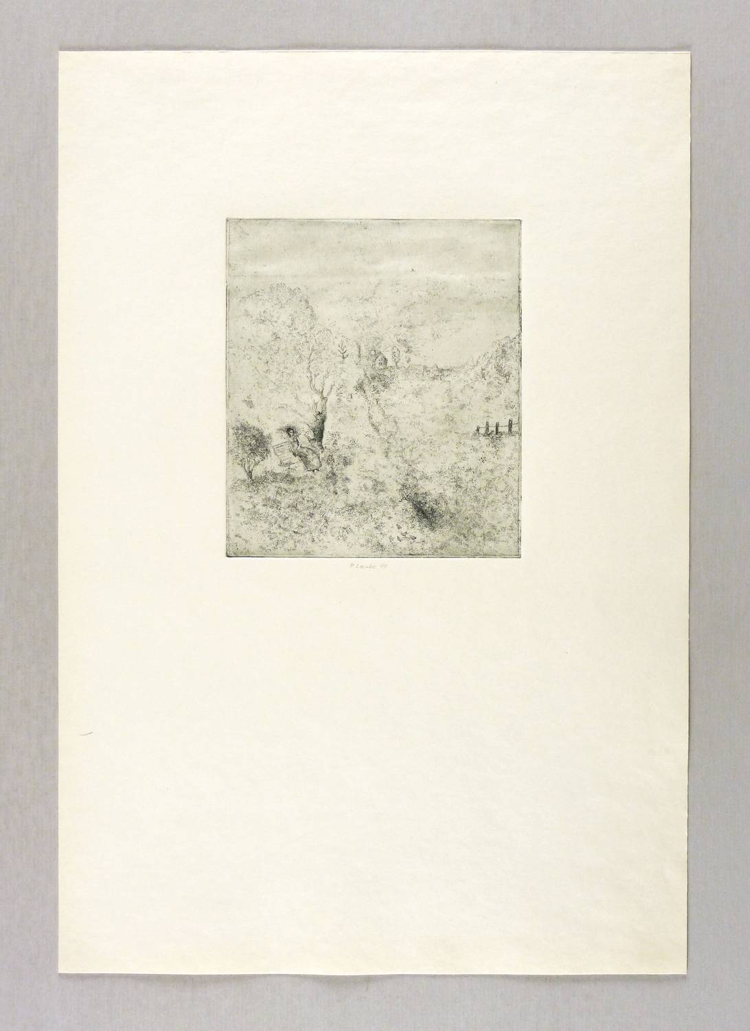 1977. Radierung / Strichätzung & Aquatinta, mit Plattenton, in Schwarz, auf gelblichem Velinkarton. – Originale Künstlergrafik, von Peter Laube. – 14,2 x 12,2 cm (Darstellung / Platte), 39 x 27 cm (Blatt).