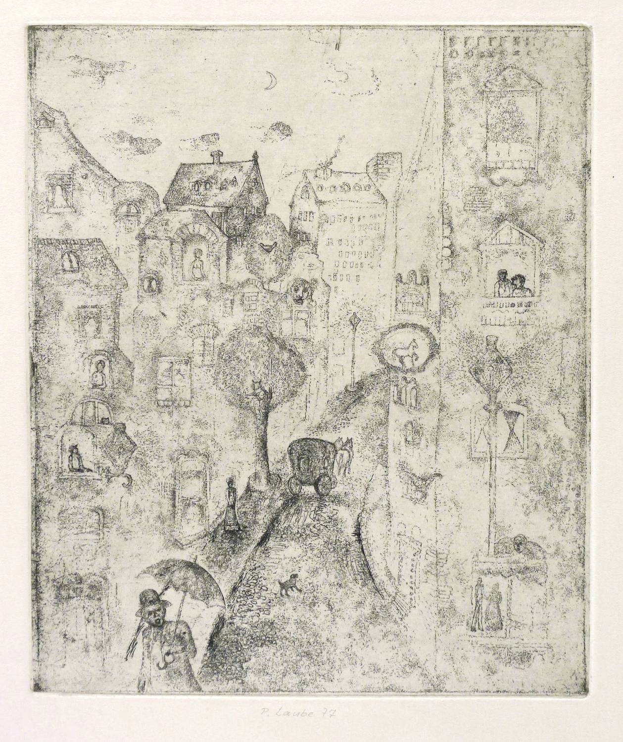 1977. Radierung / Strichätzung & Aquatinta, mit Plattenton, in Schwarz, auf gelblichem Velinkarton. – Originale Künstlergrafik, von Peter Laube. – 14,5 x 12,1 cm (Darstellung / Platte), 39 x 27 cm (Blatt).